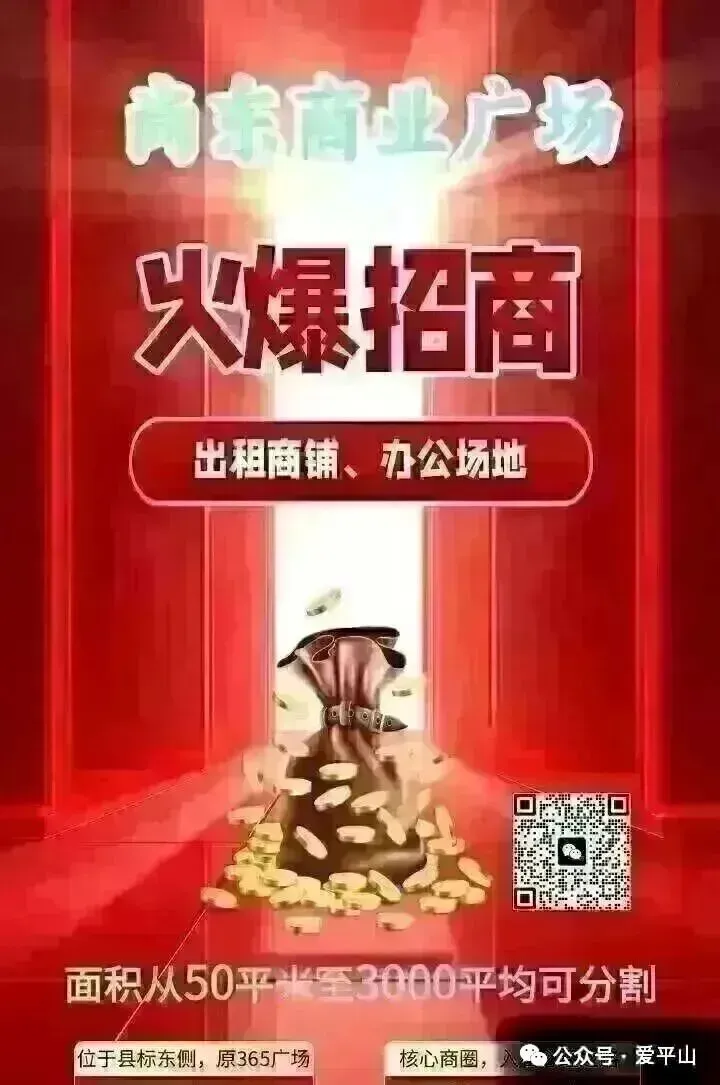平山尚东商业广场(在县标东边)火爆招商,有商铺、办公场地招商中,面积从50平米至3300平米均有,欢迎儿童娱乐、电玩、健身场馆、服装城、连锁酒店、公司办公、婚宴餐饮、教培机构等客户考察洽谈,合作政策宽松优惠。咨询电话:13315158678王经理(1.31)