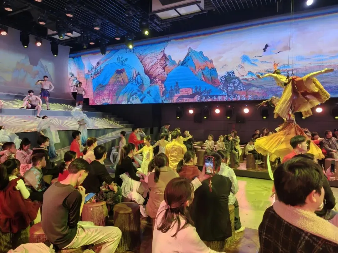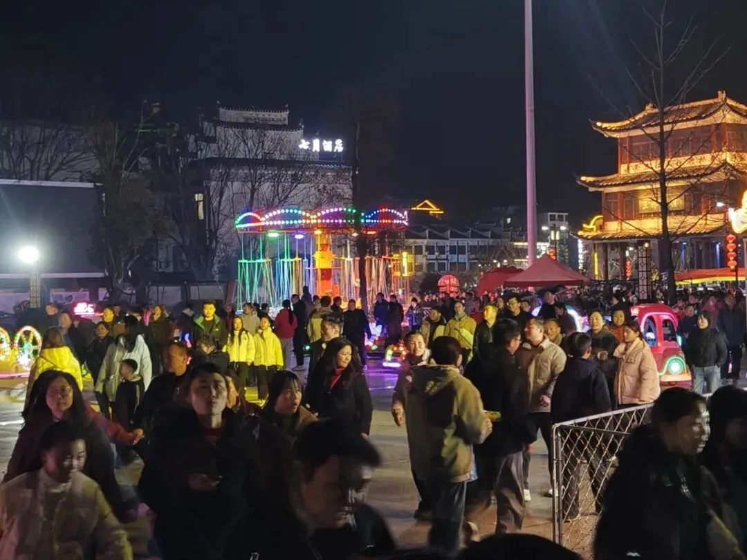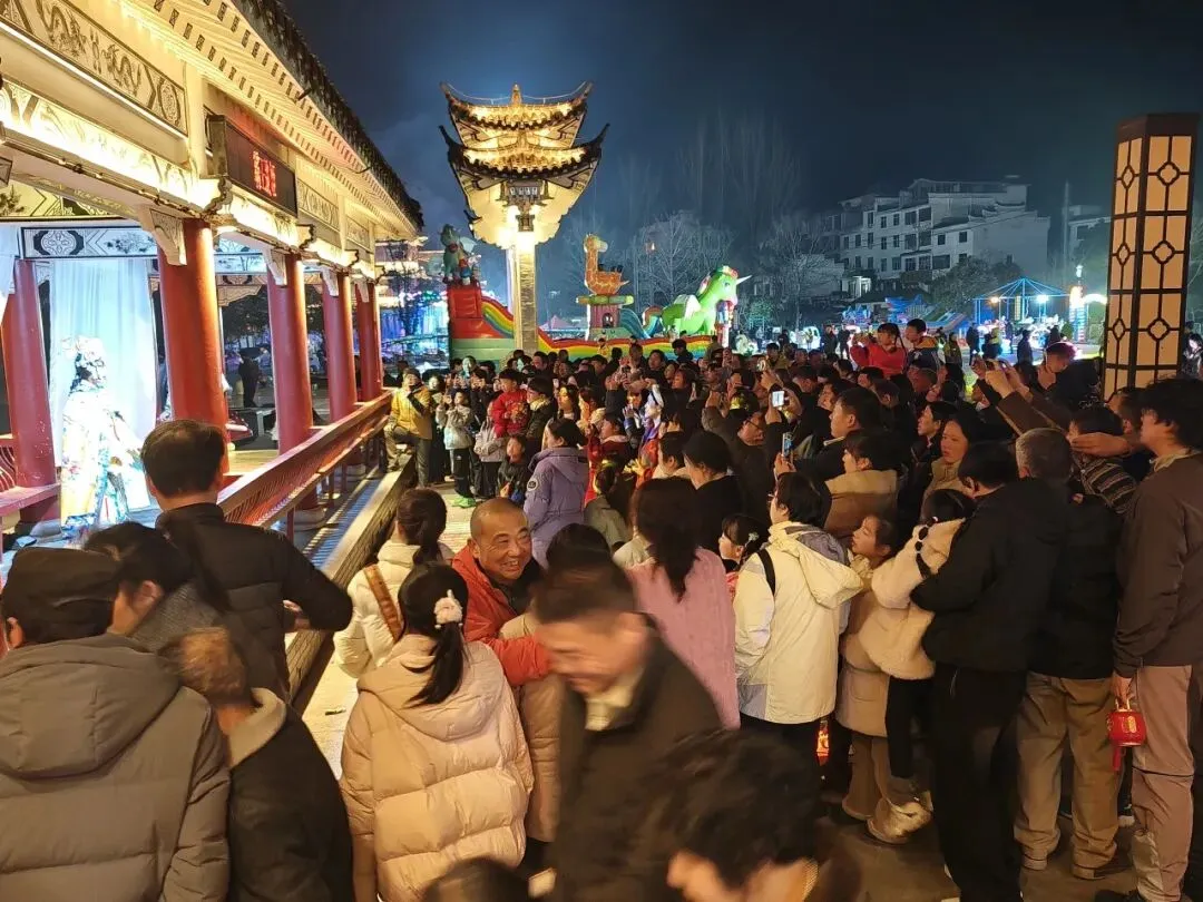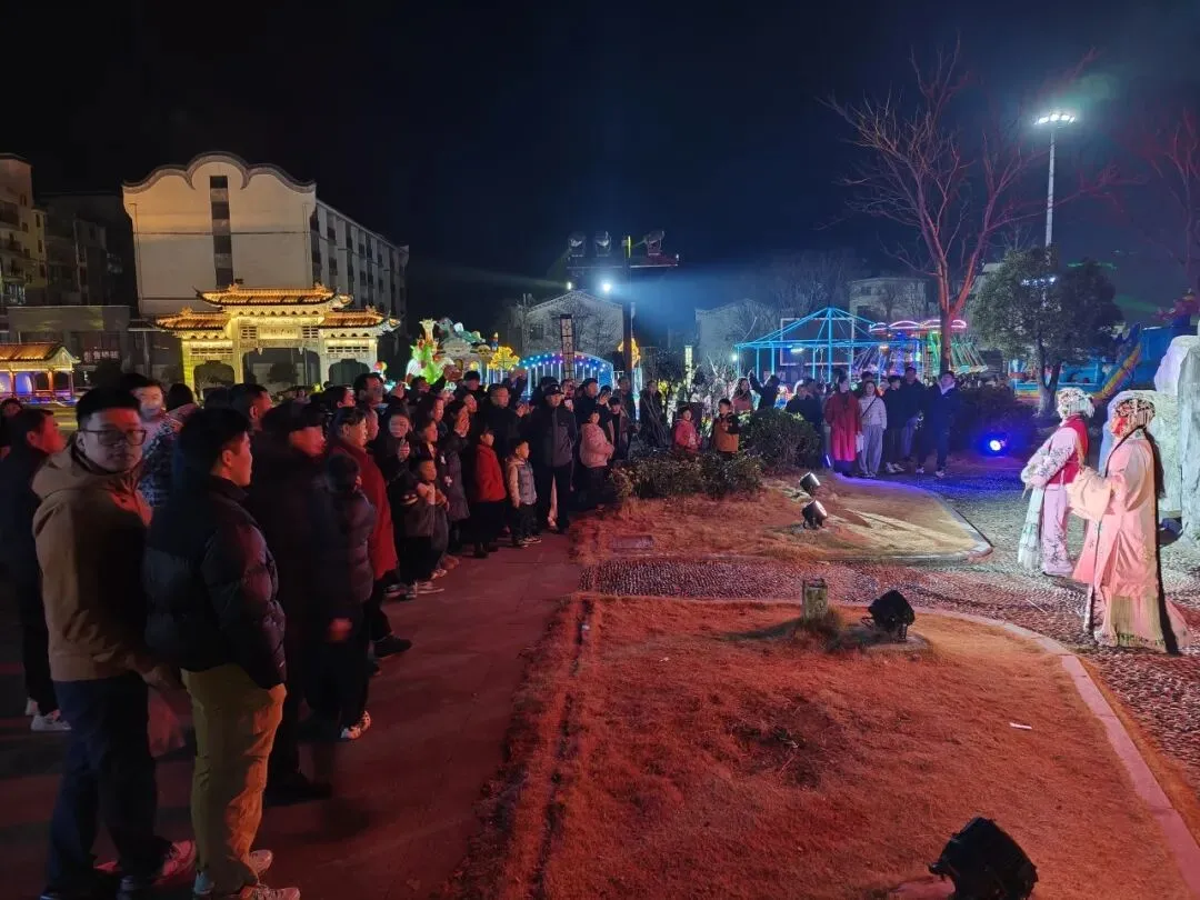 鸠兹古邑街区,京剧传唱,光影流转间,大家沉浸式感受着罗田民俗的独特魅力。