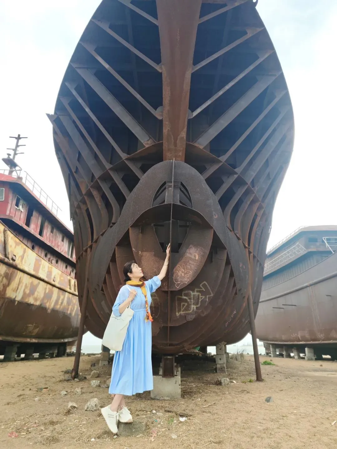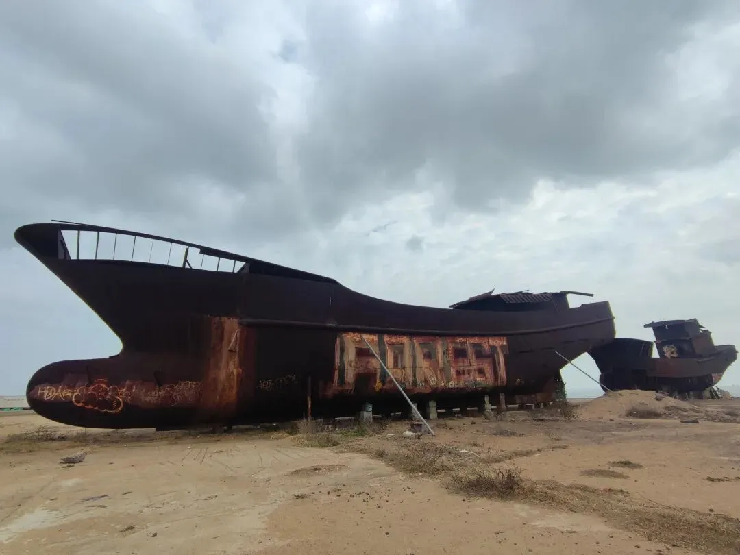 新埠岛还有一处网红拍照打卡地一一“森江沅船业旧船厂”。它地处岛的东北侧,南渡江入海口处。曾经的船厂早已不知所踪,只见空况的地面上停放着5艘长约20一30米长的锈蚀严重的钢制船舶残骸。