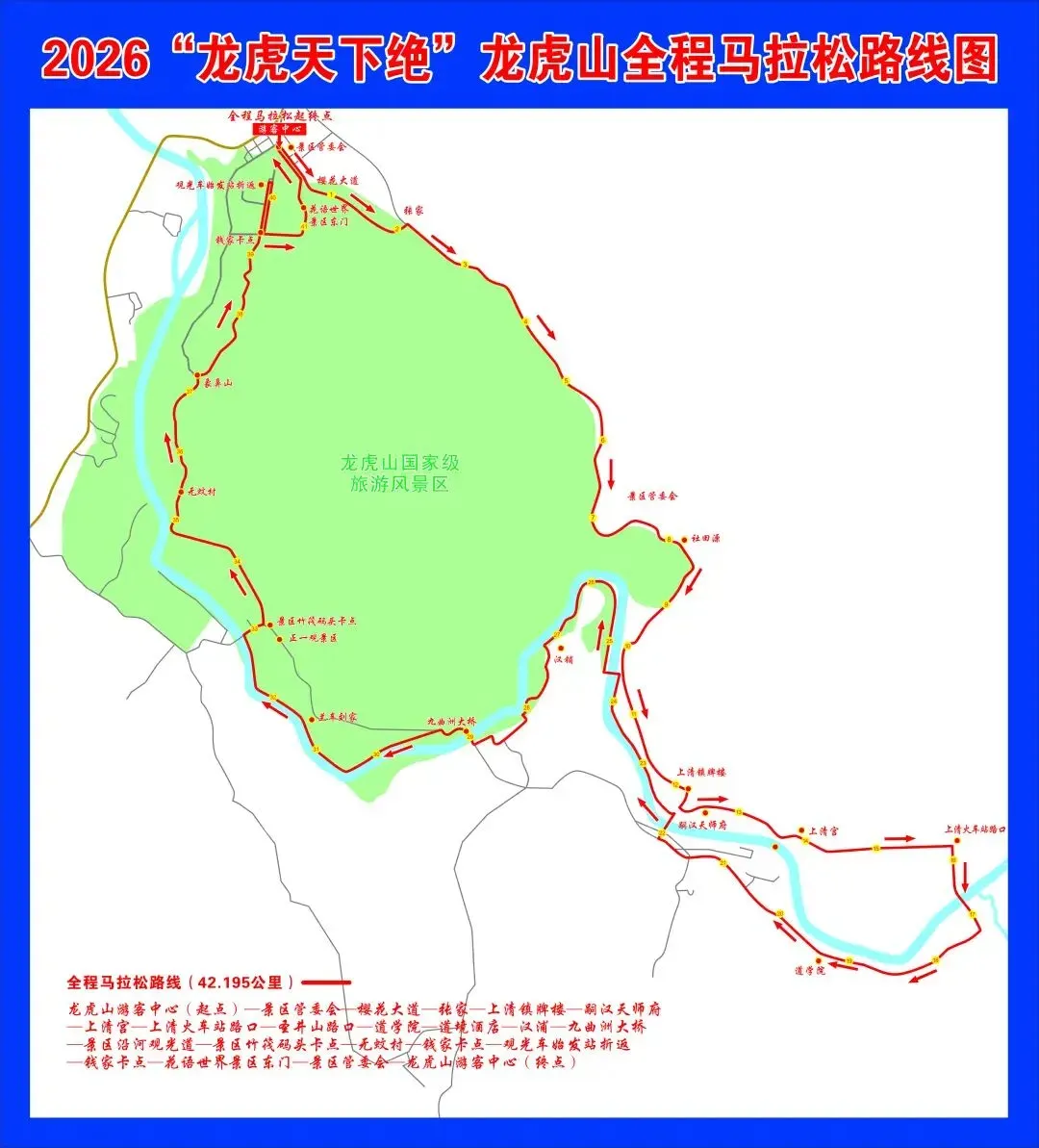 (一)马拉松龙虎山游客中心(起点)——景区管委会——樱花大道——张家——上清镇牌楼——嗣汉天师府——上清宫——上清火车站路口——圣井山路口——道学院——道境酒店——汉浦——九曲洲大桥——景区沿河观光道——景区竹筏码头卡点——无蚊村——钱家卡点——观光车始发站折返——钱家卡点——花语世界景区东门——景区管委会——龙虎山游客中心(终点);