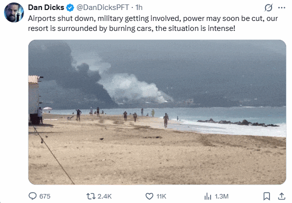游客目击:火光与浓烟来自多伦多的39岁游客Tim Spencer正在Puerto Vallarta度假,他表示,早晨城市就开始出现火灾。他登上Villa Divina酒店屋顶时,看到街角商店和车辆都在燃烧。“现在这里到处都是烟雾,灰蒙蒙一片,空气中还有刺鼻的烧焦气味,就像燃烧的油料味,非常难闻。”