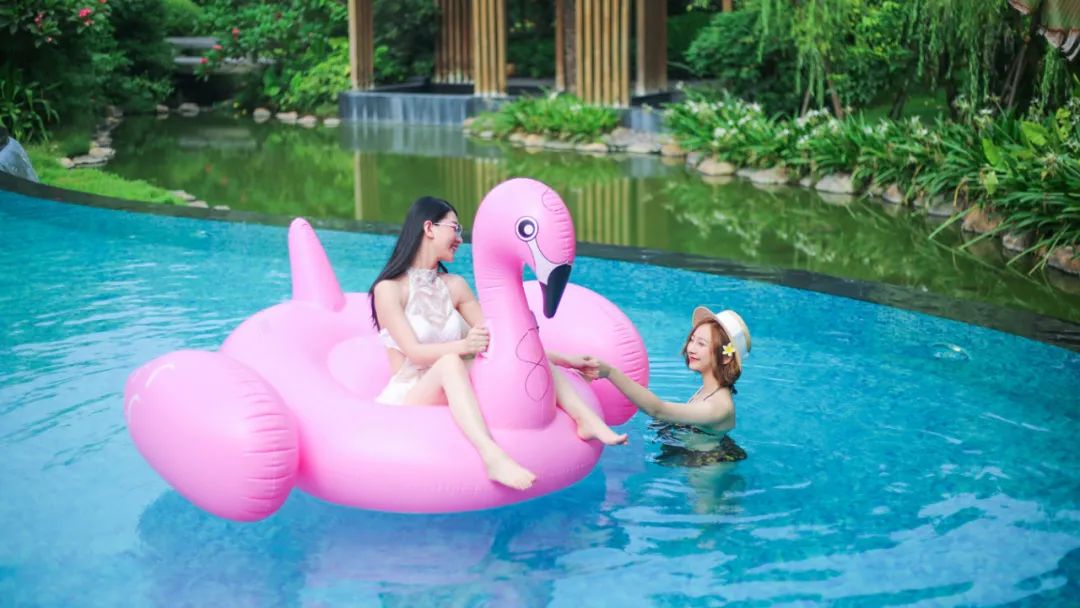 无边际泳池,一望无边的蓝本身就很出圈,还有红遍ins的的火烈鸟、独角兽泳圈供玩乐拍照!