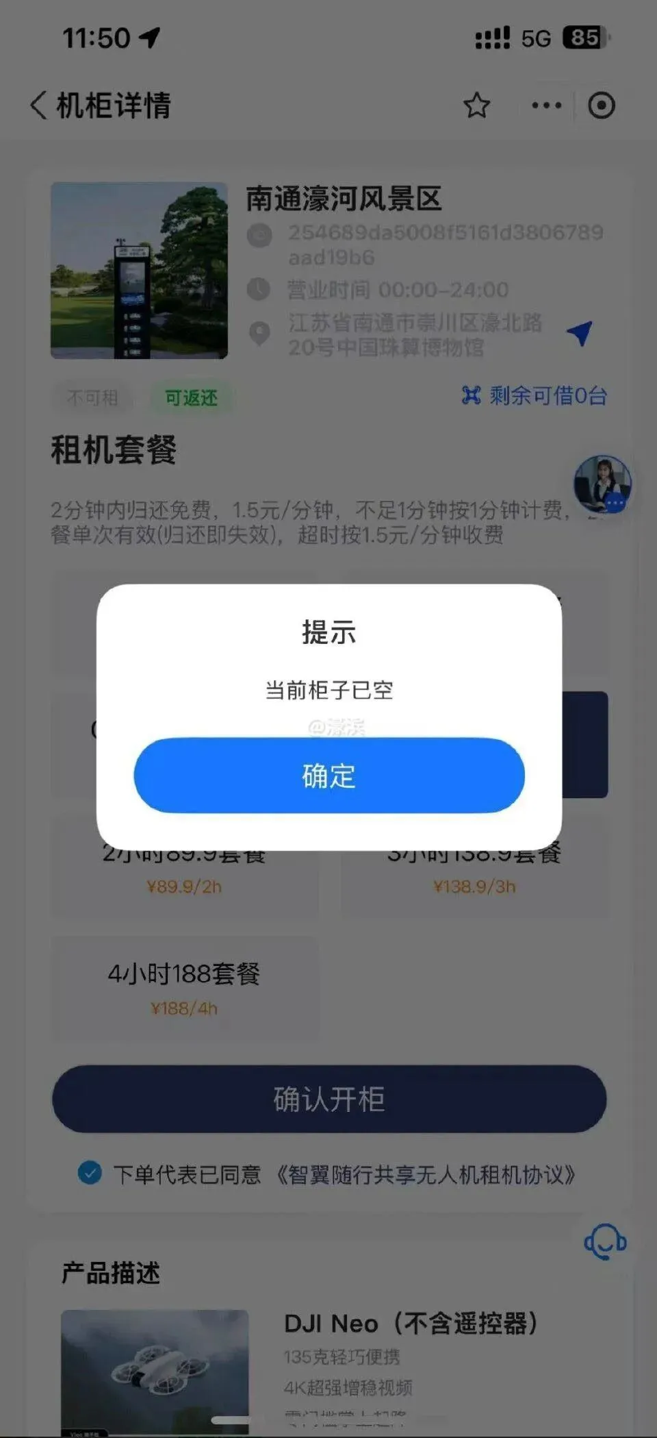 适逢春节假期,风和日丽天气不错,想着去体验一下“空中摄影师”的感觉,结果找到地方一看,完全打不开柜门。明明柜子里有无人机,但显示剩余可借0台。