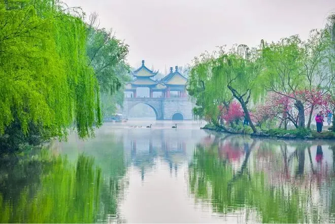 三月便能见到其垂垂绿柳、百花盛开的景象。