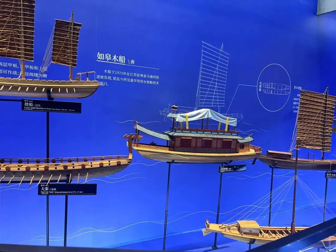 蓝色河面背景,错落悬浮着历朝各类舟船,百舸争流。流线型的参观模式,船模配合有多媒体互动,可以了解到船只的朝代、作用、工艺等。
