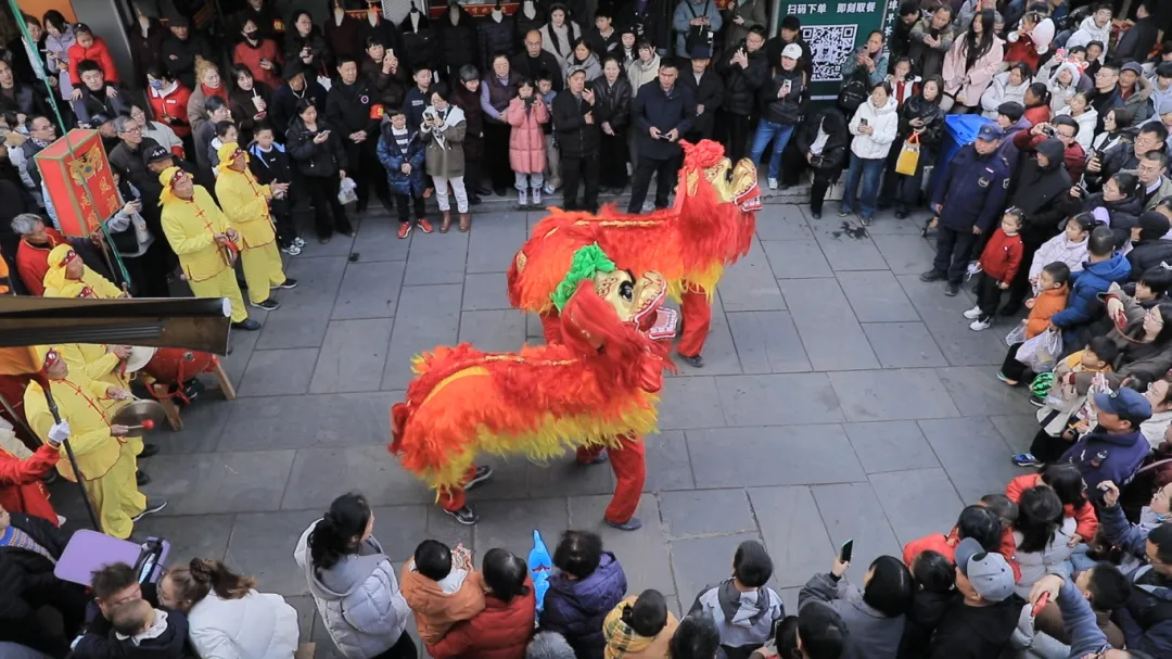 春节假期,不少游客来到兰溪游埠古镇,感受了一把非遗热。舞狮队伍引来众多市民游客驻足围观,争相与面前喜庆可爱的瑞兽合影互动。