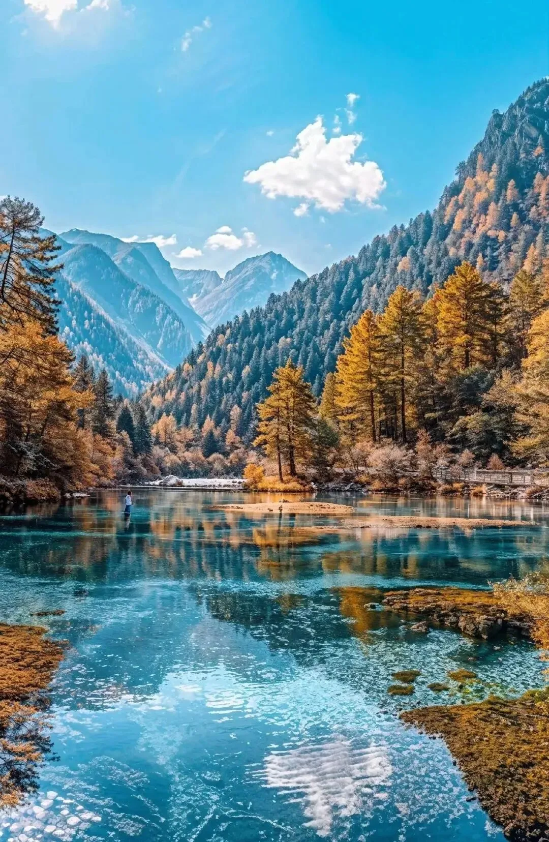 九寨沟的美,美在那一池池如宝石般纯净的海子。翠绿、湛蓝、金黄,层次分明的色彩如调色盘般绚烂。秋日的九寨更是美得惊心动魄,红叶满山,倒影如画,每一眼都是永恒的记忆。