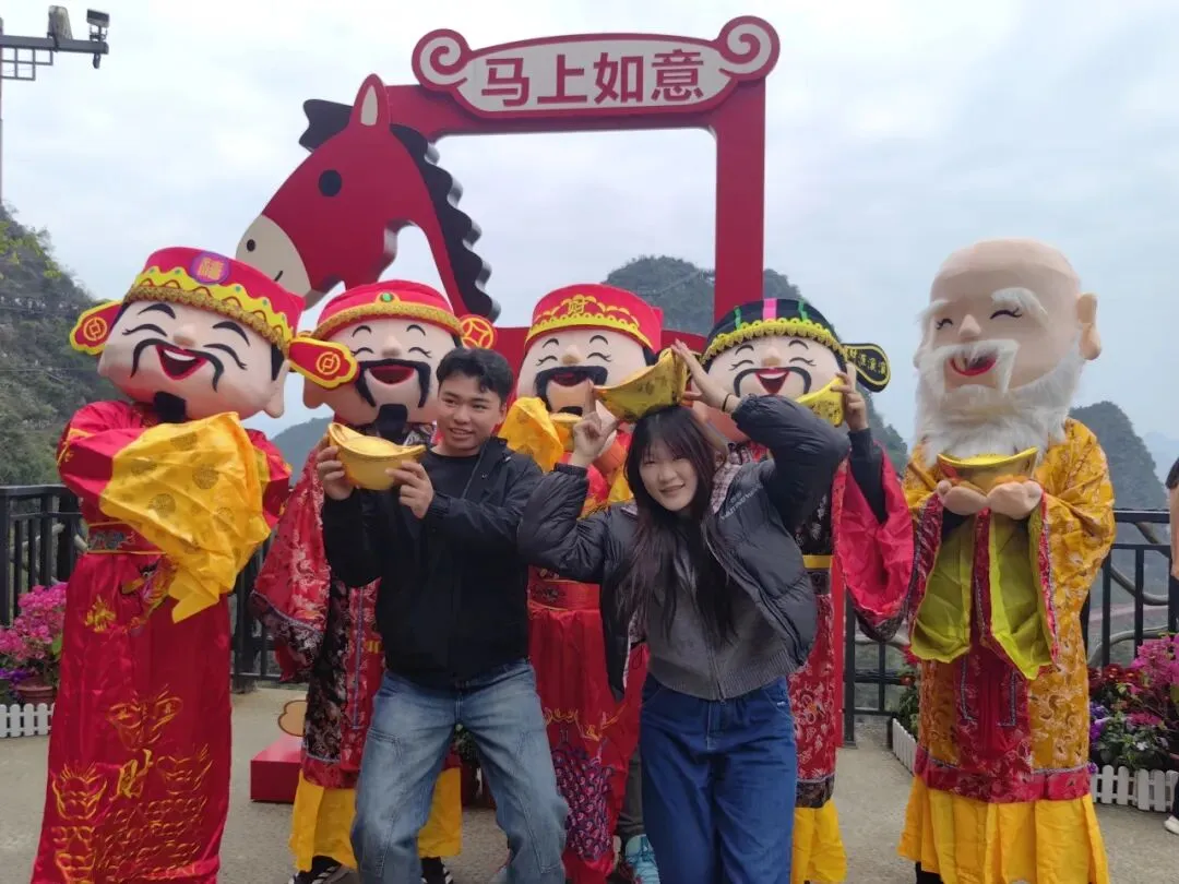 景区开展丰富多彩的“迎新春”系列主题活动,大年初一,非遗拓印体验与新春“抓马”夹礼挑战吸引众多游客亲手制作福字、赢取好礼。正月初五“迎财神”更是活动高潮——五路“财神”巡游送福,将金币巧克力派发至游客手中,欢声笑语回荡峰林,为马年新春讨得“马到成功”的好彩头。