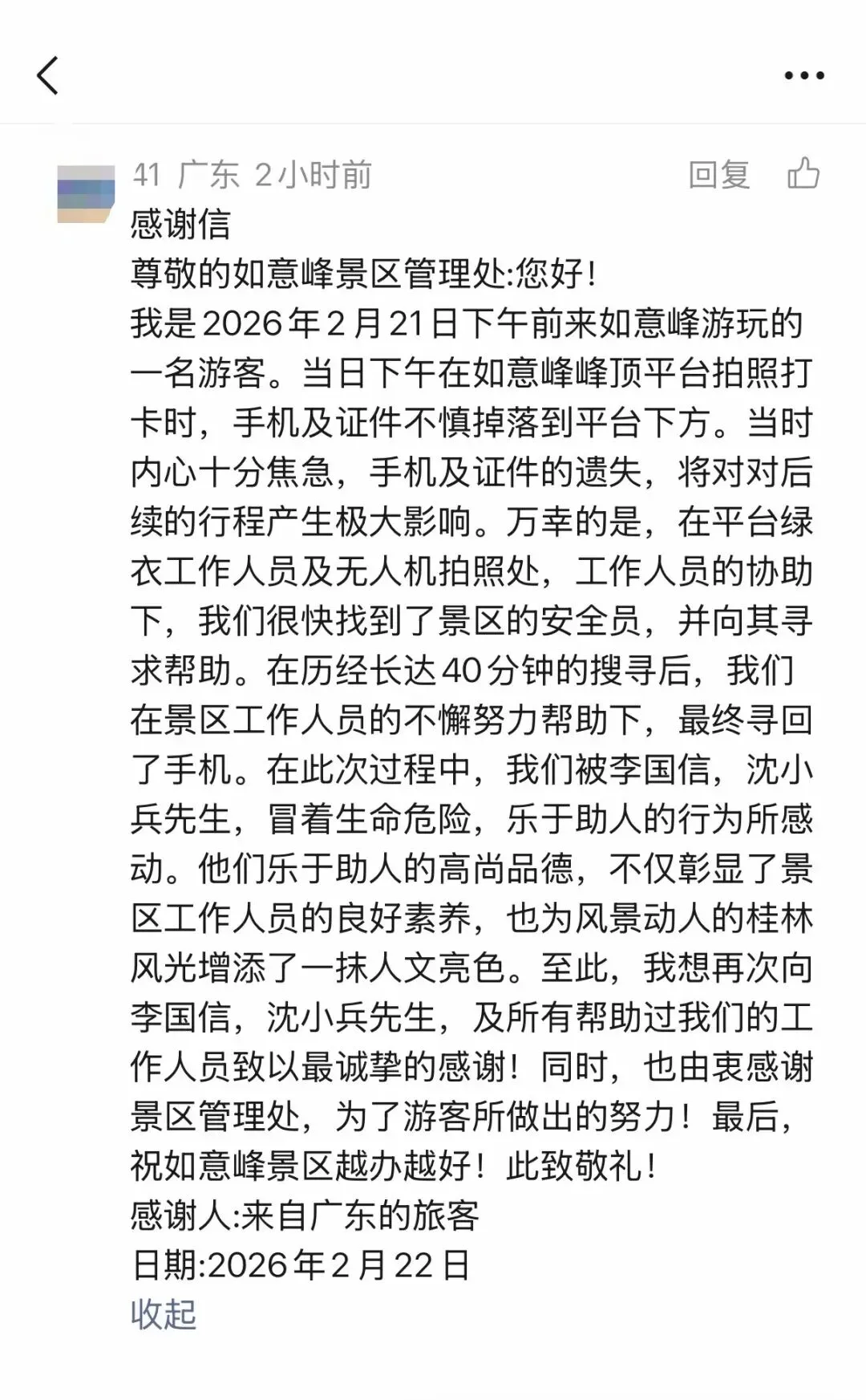 全员坚守显担当,温情服务暖人心。春节假期期间,景区各部门职责明确、密切配合,全员以饱满热情投入接待工作。工作人员用真诚与微笑为游客提供周到服务,涌现出拾金不昧、紧急寻人、失物招领等暖心好人好事共计45件。无论是帮助游客寻回滑落观景台的手机证件,还是协助走失儿童重回家人怀抱,每一个暖心瞬间都生动诠释了“以人为本,游客至上”的服务理念,让壮美山水间更添人文温度。