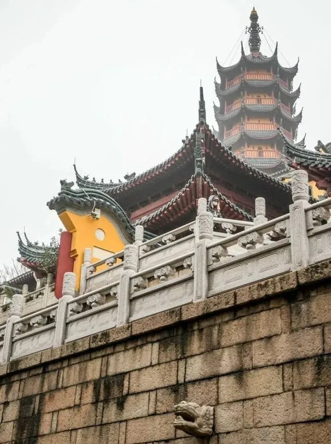 金山寺,又名江天禅寺,还有龙游寺等曾用名,山门的牌匾上“江天禅寺”四字,为康熙所书,大雄宝殿周围围着雕花白石柱,金色琉璃瓦覆顶,在周围一片黑色、青色的屋顶间格外显眼,非常气派。