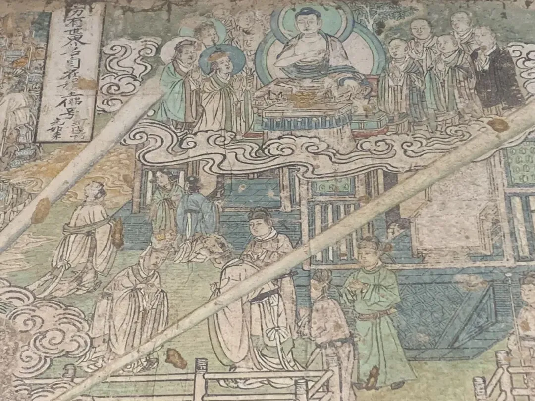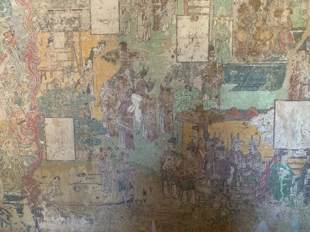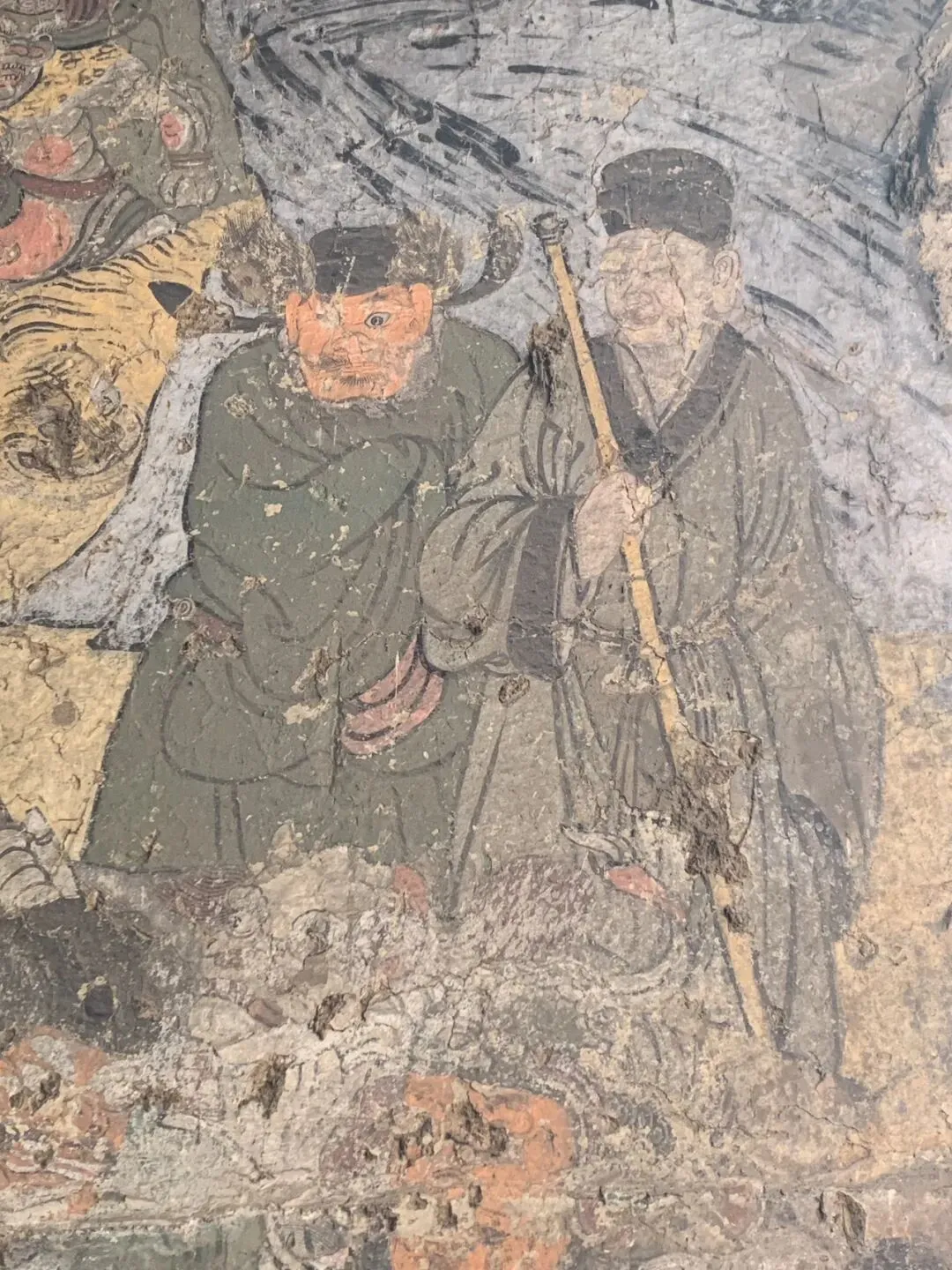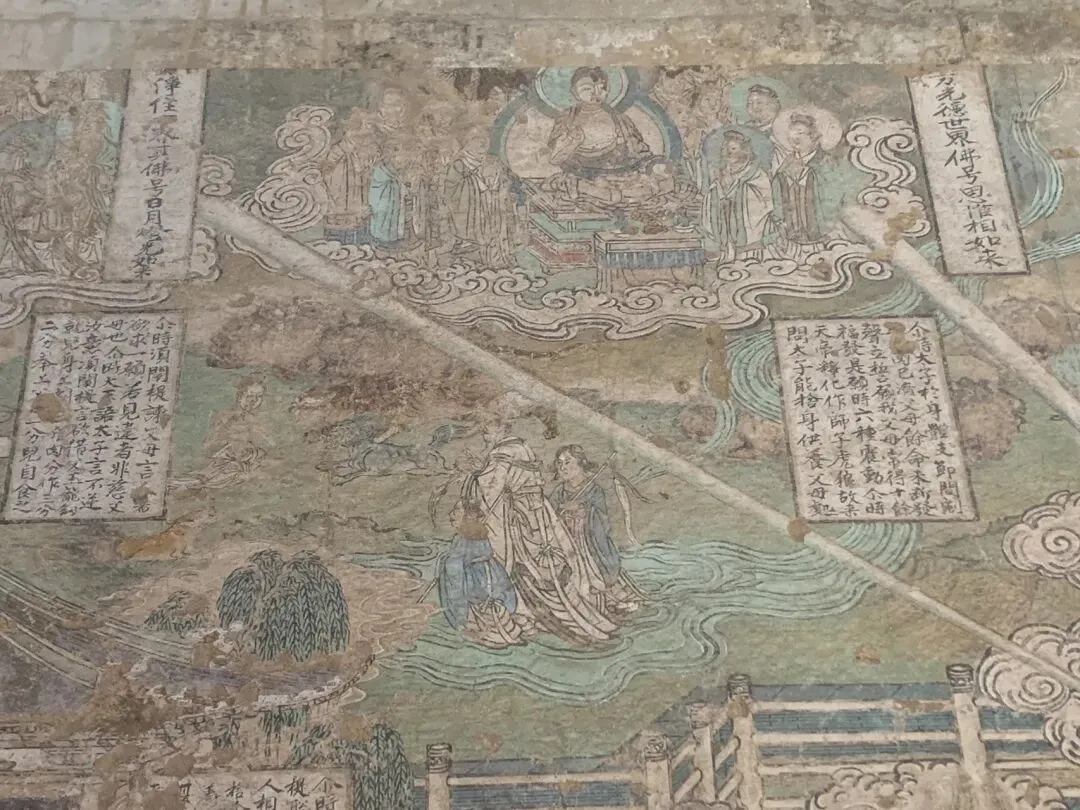 在东西两边的偏殿,当地的文保部门和中国美术学院合作高清复原了壁画的全貌,色彩、题记、人物逼真,看起来就非常过瘾。