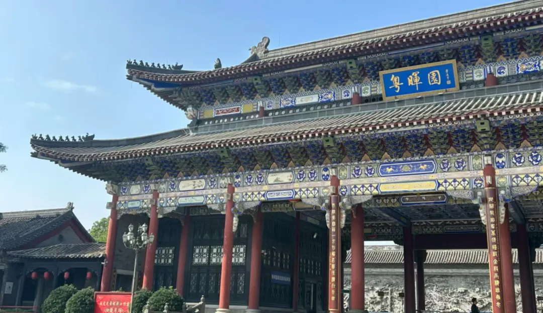 走进粤晖园,首先映入眼帘的是气势恢宏的东正门。这座三重檐建筑通高10多米,斗拱梁柱饰以和玺彩绘,富丽堂皇的彩绘。门前广场两侧的厢房通过长廊相连,形成独特的空间序列,展现了岭南的古建筑的精湛工艺。