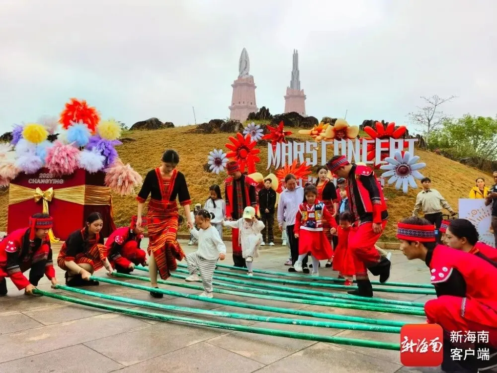 春节假期,游客在海南长影奇幻乐园体验竹竿舞。受访者供图