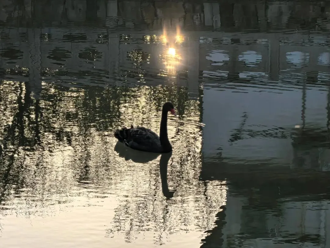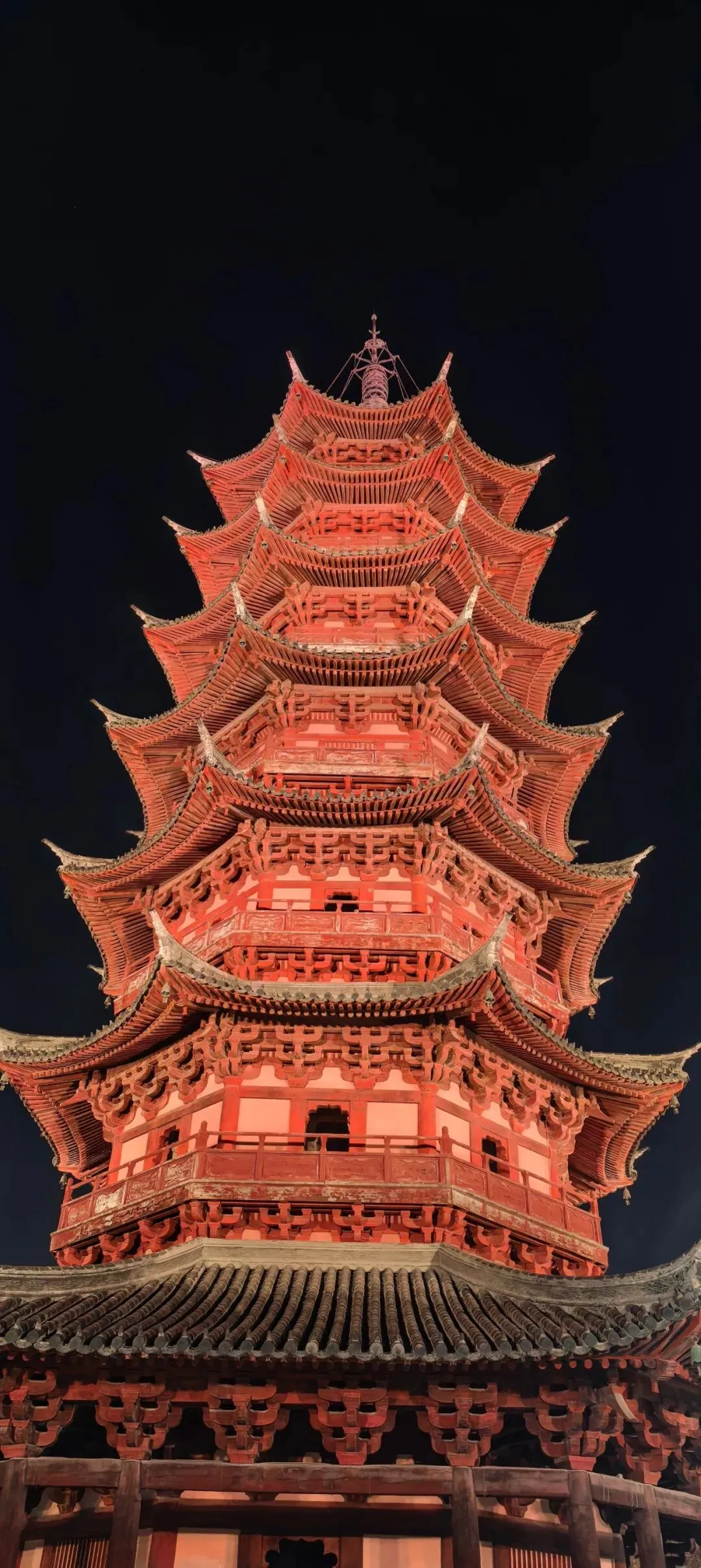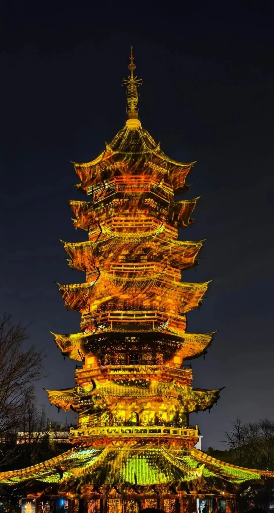 傍晚时分瑞光塔的倒影正好延续出了一束阳光