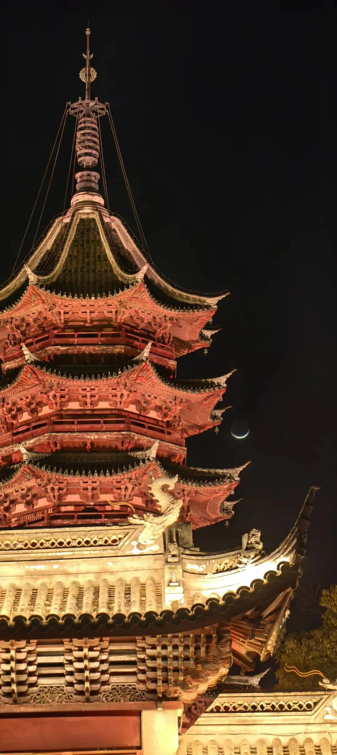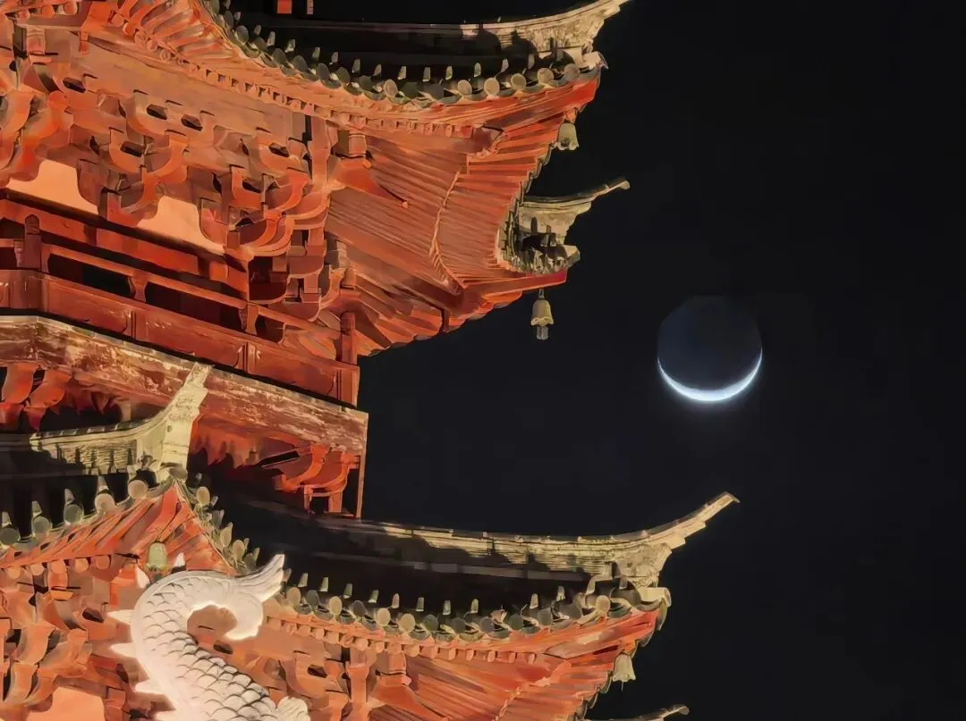 在出口处恰好看到一轮新月挂在瑞光塔的屋檐角。