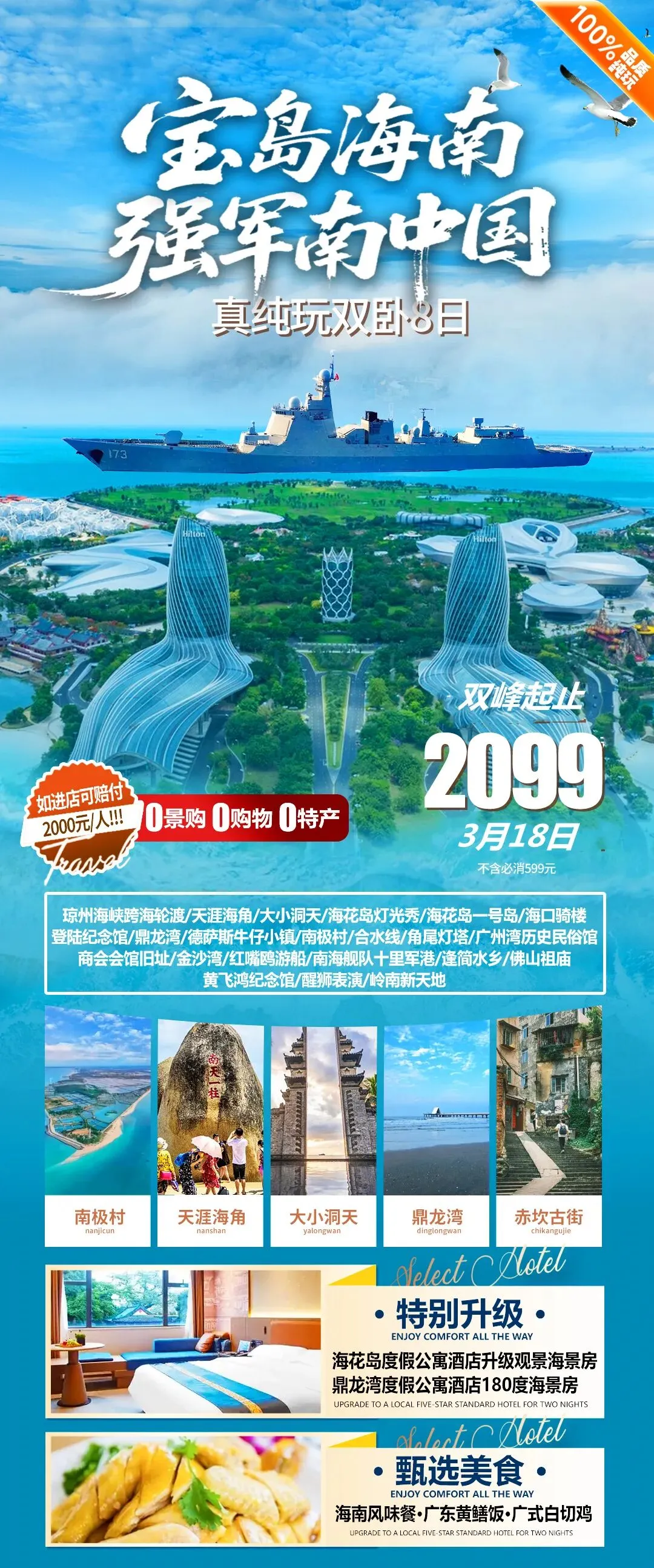 用餐:包含 5早8正餐(升级特色黄鳝饭+广东白切鸡+海南风味餐)