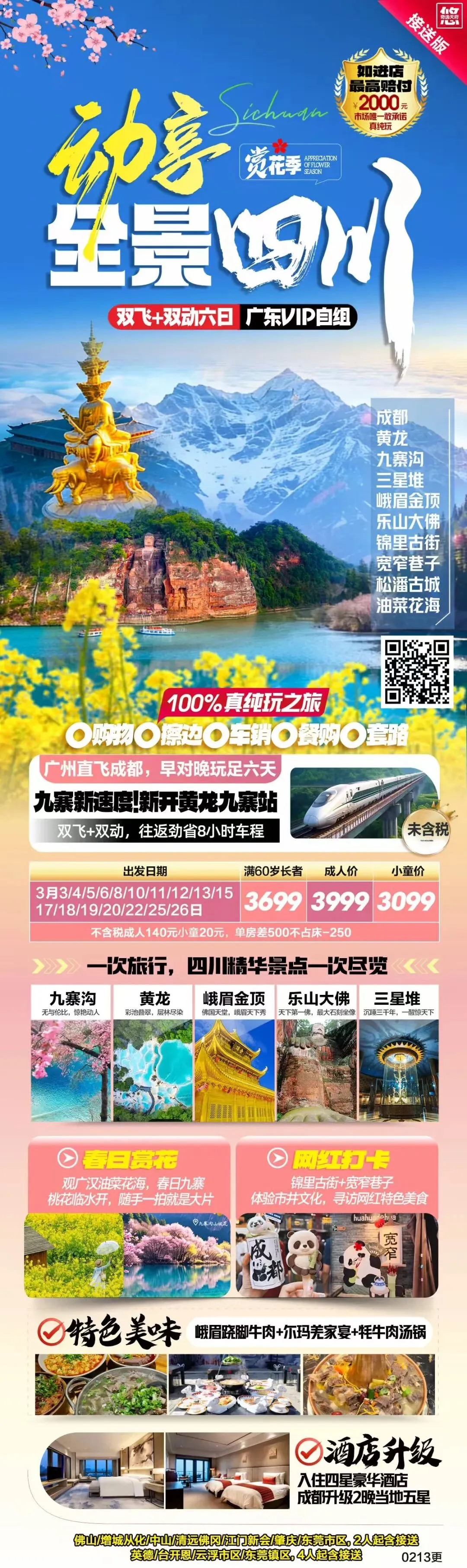 赏花季广州直飞成都早对晚玩足六天让旅游回归本质,真正纯玩!动享全景四川#双飞+双动6日0购物0擦边0车销广东自组