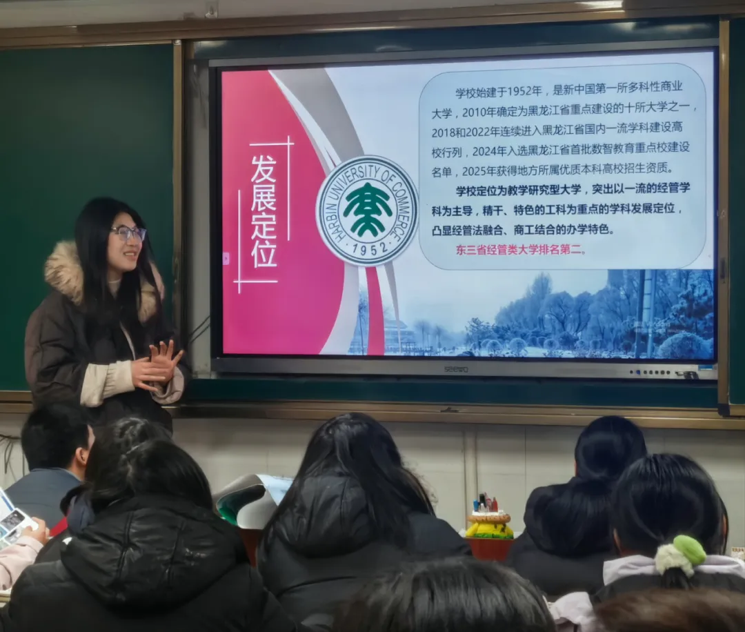 作为新中国第一所多科性商业大学,哈尔滨商业大学宛如一座矗立在商科领域的巍峨灯塔,承载着厚重的历史积淀与深厚的商科底蕴。夏安在宣讲中介绍道:“在这里,‘经世济民’的学术氛围如同一股无形的力量,激励着每一位学子奋发向上。学校拥有博士、硕士、学士完整的多层次人才培养体系,就像一座精心打造的学术阶梯,为不同层次、不同追求的学子提供了广阔的发展空间。王牌的经济学、管理学专业,如同哈商大的璀璨明珠,凭借卓越的师资力量和严谨的治学态度,培养出一批又一批具有国际视野和创新精神的商业精英;蓬勃发展的工科与法学专业,也在不断探索创新,为学子们搭建起通往成功彼岸的坚实桥梁。”