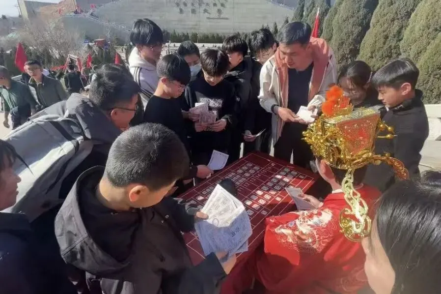 朝阳山景区,商王带队巡游送福,非遗表演燃爆现场,喝彩声此起彼伏。投壶、射礼、百福墙打卡、NPC 互动挑战等趣味游戏接连不断,玩游戏赢好礼,轻松解锁新年好彩头。