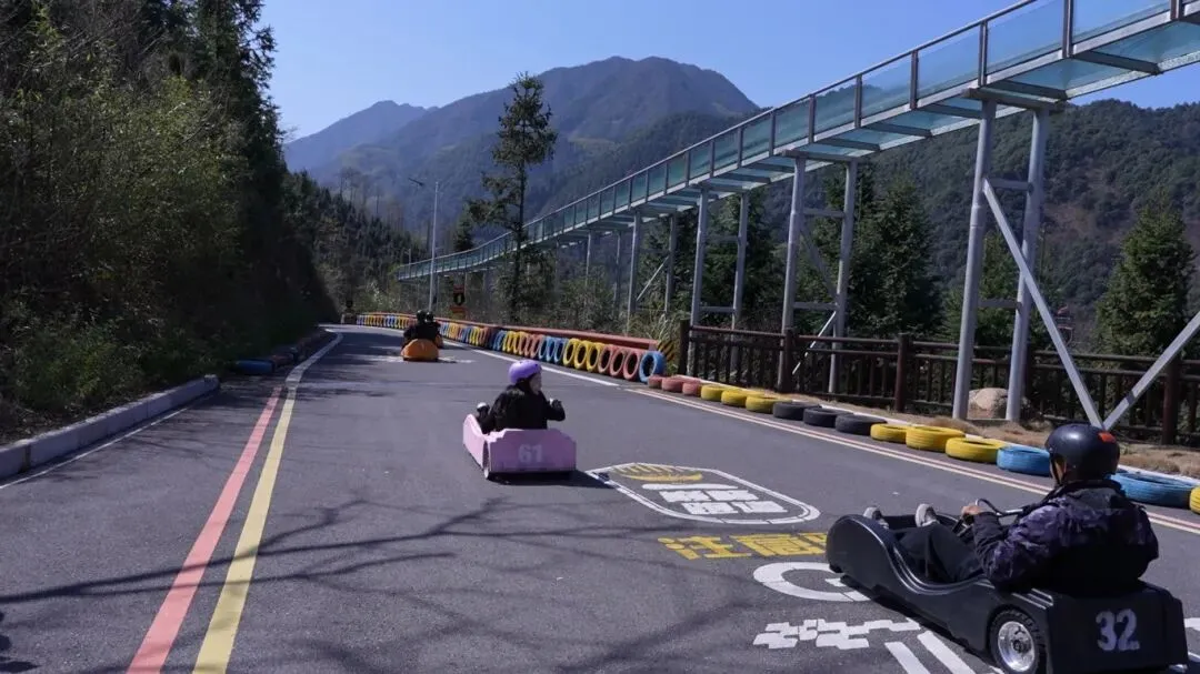 走进景区,喜庆的氛围扑面而来。玻璃漂流与新西兰滑板车两大核心项目前,等候体验的游客排起长队,工作人员引导有序,现场热闹而不拥挤。刚从玻璃滑道飞驰而下的苏州游客梅祖阅,仍沉浸在刺激的体验中。不远处的滑板车赛道上,五颜六色的车辆往来穿梭,大人小孩的欢笑声在山谷间久久回荡。