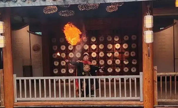 活动现场人声鼎沸,村民们扶老携幼、欢聚一堂,处处洋溢着团圆喜乐的节日气息。伴随着铿锵锣鼓,川剧表演惊艳登场。演员衣袖翻飞、神情灵动,红、黑、蓝、白等脸谱瞬息变幻,一招一式尽显功底,引得观众目不转睛、掌声不断。喷火绝技更是将气氛推向高潮,火柱腾空、流光溢彩,寓意新的一年红红火火、万事兴旺,现场欢呼声、喝彩声此起彼伏。