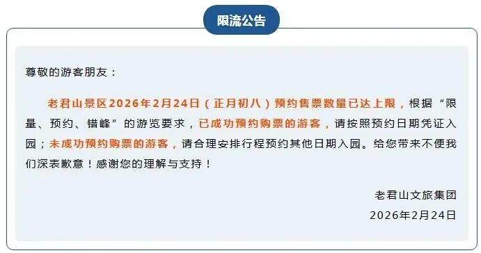 2026年2月24日(正月初八)洛阳老君山景区预约售票已达上限,景区提醒游客按照预约错峰入园,未预约成功的市民请及时调整出行计划。