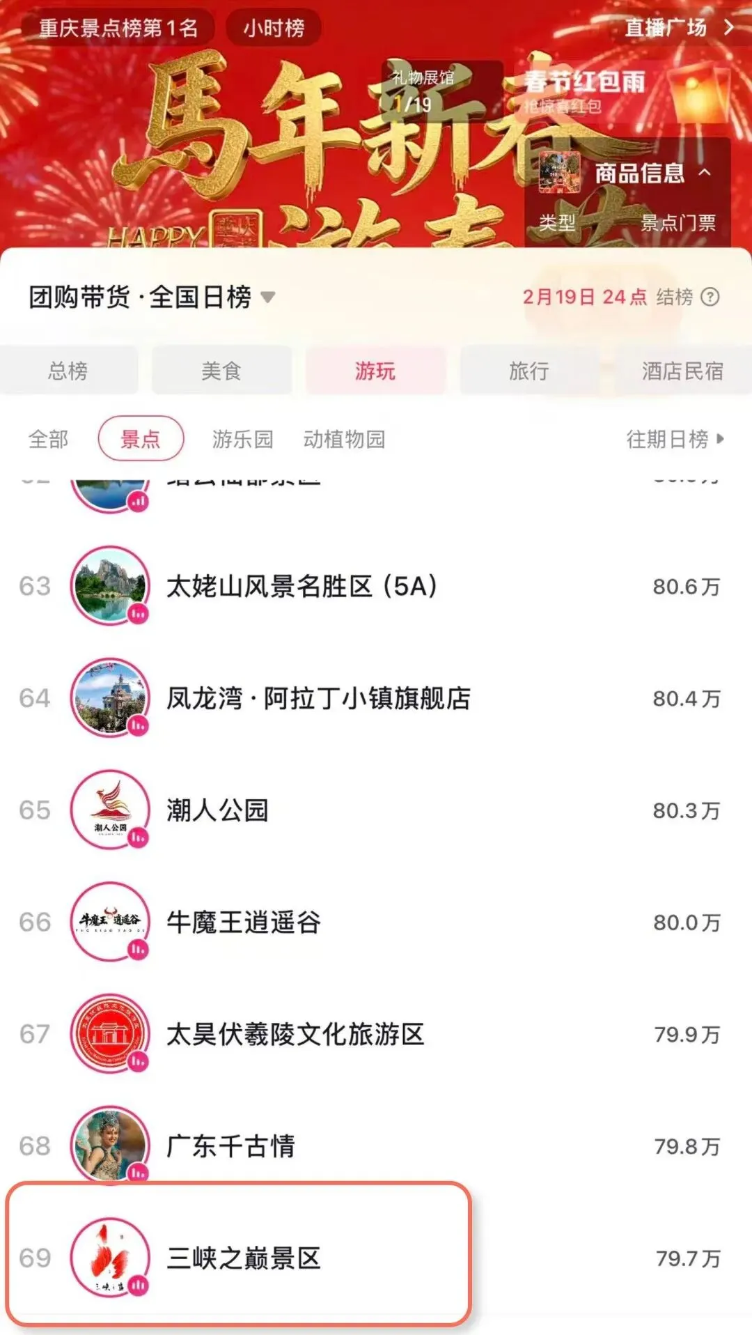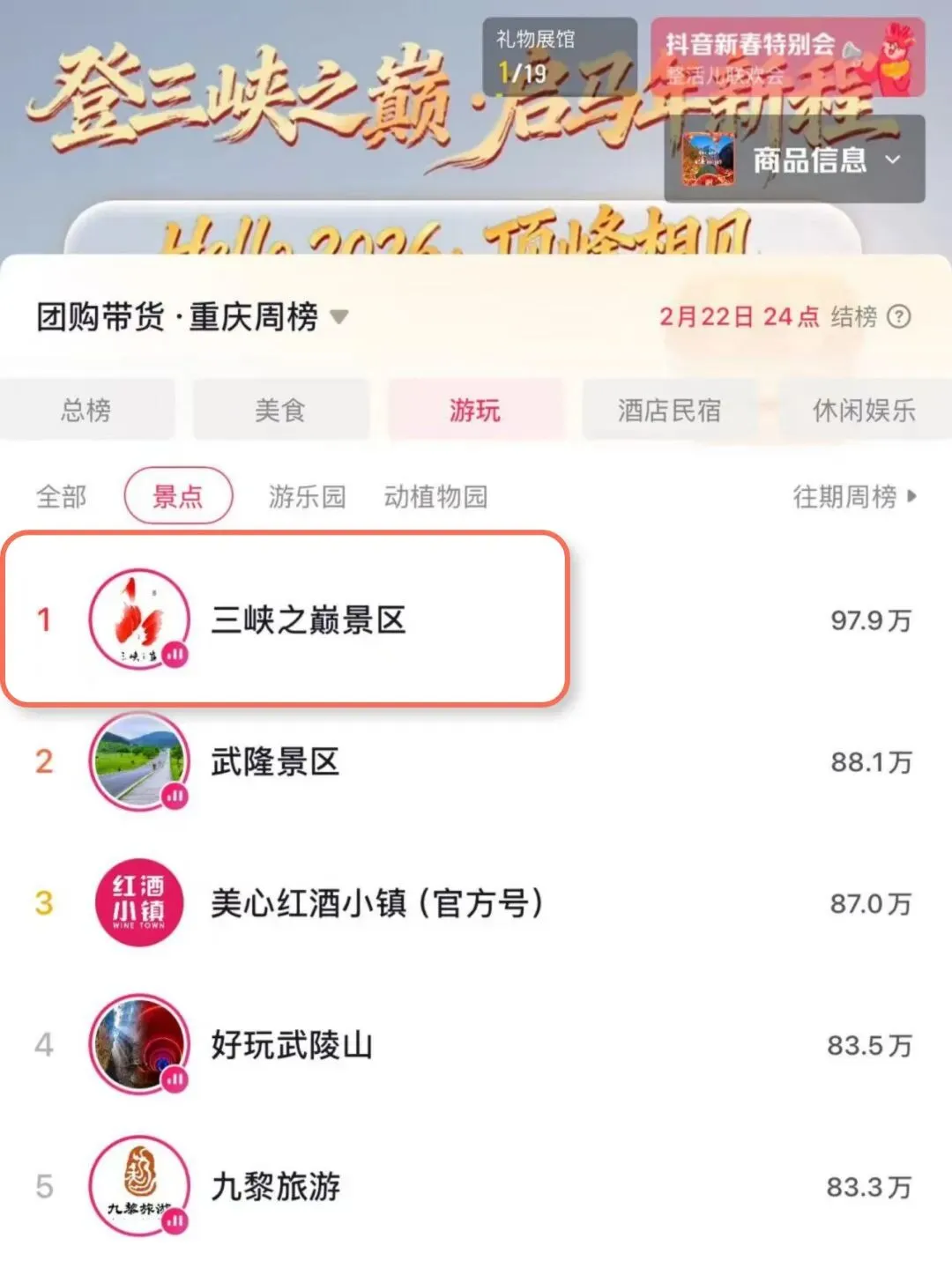 这个春节,三峡之巅景区直播间连续 5 天荣登重庆景点直播团购榜 TOP1,同时在全国景点直播榜单中也收获了亮眼成绩。