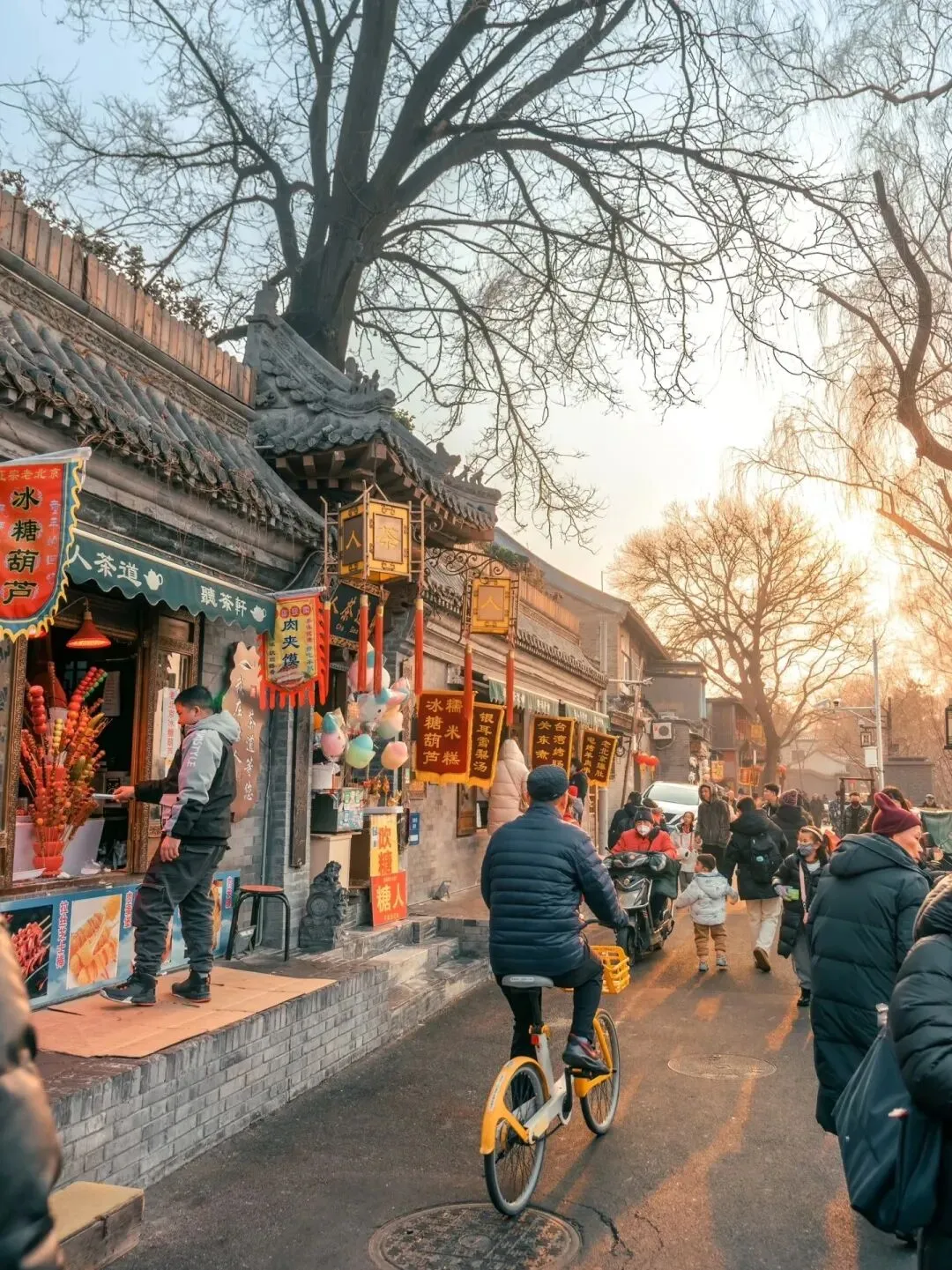 胡同里的年货大集,春联、福字、糖葫芦、兔儿爷摆满摊位。晚上去什刹海滑冰车,冰面倒映着两岸的烟花,恍惚间穿越回百年前的北平。