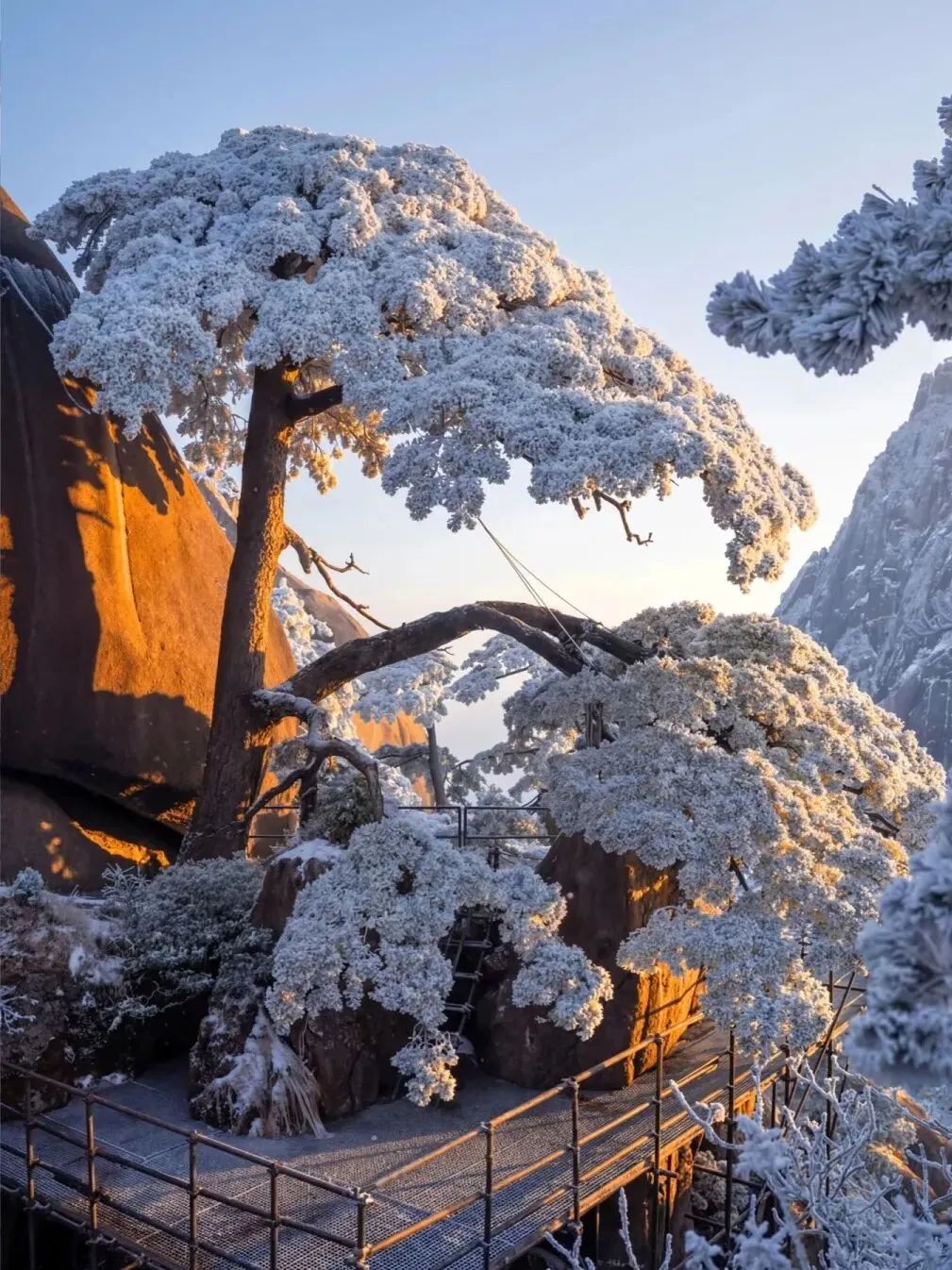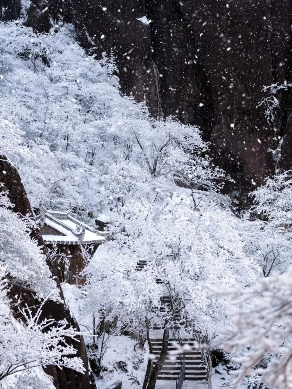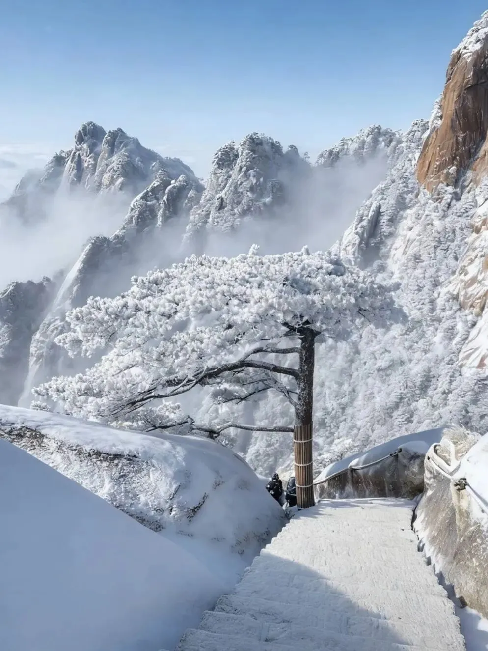 天下第一奇山,冬季变成水墨画卷。雪后初晴,云海翻腾,奇松怪石在白雪覆盖下只露出轮廓,黑白灰三色交织成流动的水墨。