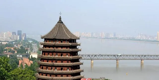 图中江畔的高塔叫六和塔,塔身层层往上收,伞状檐角抖着细细的弧线,旧照里江面开阔,白帆一片,塔脚边是密密的树影和泥岸的质感,现在帆影没了,横在江上的大铁桥把两岸紧紧拽住,爸爸说他年轻时骑车过桥,风一顶,塔身在侧一直护着视线,老塔没挪地儿,身量还是那股沉稳劲儿。
