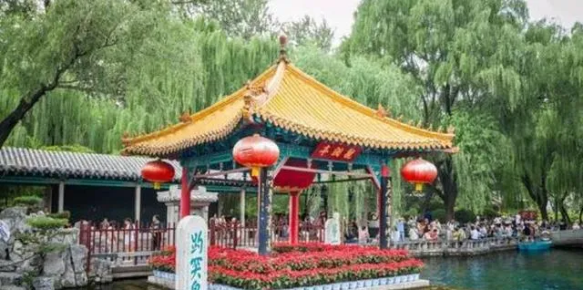 泉边这座小亭叫趵突泉泺源堂,旧照里水沿石缝淌,亭檐压得低低的,牌坊前立着一排石刻,字样有点灰,现在颜色更鲜,黄瓦一照水面发亮,红灯笼挤在梁上,奶奶说小时候跟着娘来挑泉水,木桶口在水面一沉一提,耳边咕嘟的声音干净得很,现在来喝的人少了,拍照的多了。
