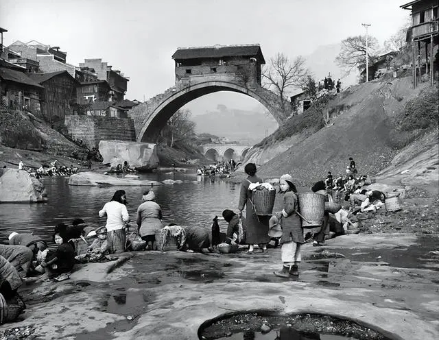 河面上的拱桥叫万州桥,旧照里桥背像弯弓,桥屋把顶压得更高,河滩上人挤人,洗衣的敲盆的喊孩子回家的不消停,现在桥不在了,岸线被小楼替了位,水面倒是更安静,爷爷指着旧照说那洞下能钻船,涨水季节浪头一到,心里吊得很。