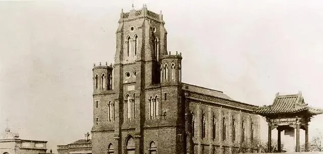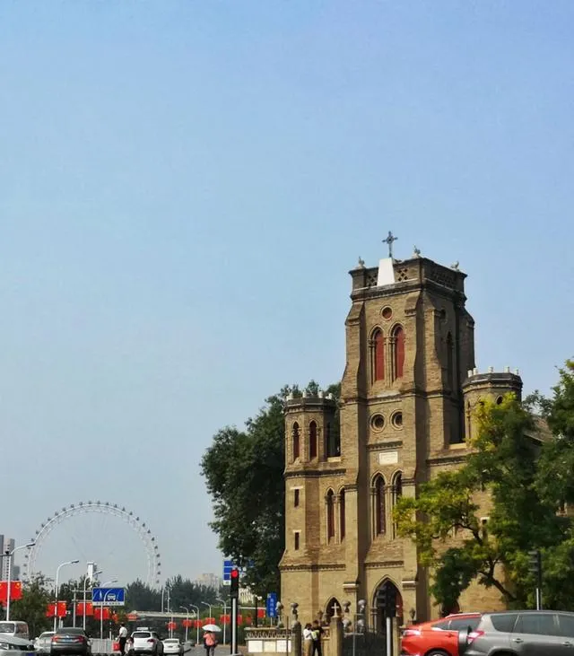 这座教堂叫天津望海楼,那会儿墙体粗粝,窗洞高高,旁边还站着一座中式牌楼,现在身后多了一个大圆环,叫天上转着的眼,车流绕着教堂走,红砖在阳光里变得柔软,老人路过会小声嘀咕一句,这楼挨过事,现在能安安静静待着就好。
