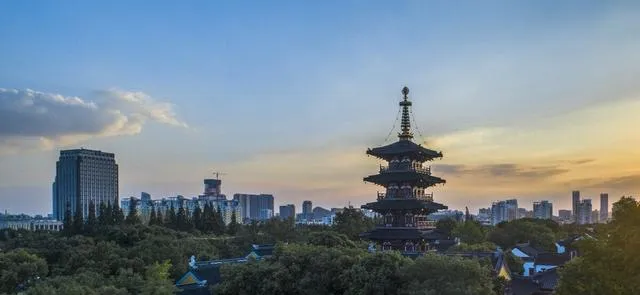 画面里的古寺叫寒山寺,旧照的檐角垂着,寺门冷清,苔痕上来了一截,现在远景看去,塔身像一盏灯插在绿海里,夕阳把边缘描得金亮,敲钟声传出去一层一层,朋友说去苏州必打卡,不为香火,就为听一耳朵水上的回声。
