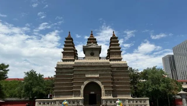这座方形塔群叫北京五塔寺,早先草从缝里钻出来,墙面一节一节压着法相,远看像一本厚书,现在院墙修葺过,纹样被阳光一刷,凹凸尽显,旁边高楼的玻璃在天上取了光,寺里人声轻,脚步绕着石狮子走半圈才肯快起来。