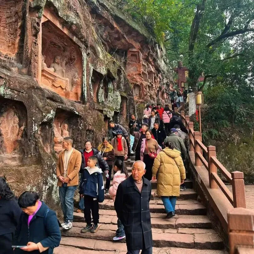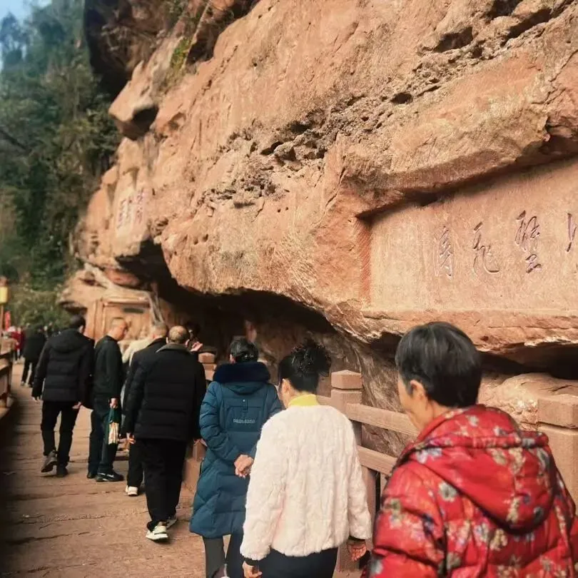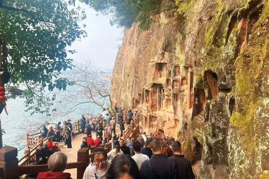 漫步古栈道,摩崖石刻栩栩如生,万咏崖上的题刻诉说着岁月变迁,青衣江碧波荡漾,春风拂面,暖意融融。许多游客放慢脚步,驻足观赏千佛石刻,感受人文与匠心,聆听东风堰的故事,感受人与自然的和谐共生。不少家长带着孩子,探寻古堰智慧,了解石窟文化,让这个春节不仅有年味,更有文化味。