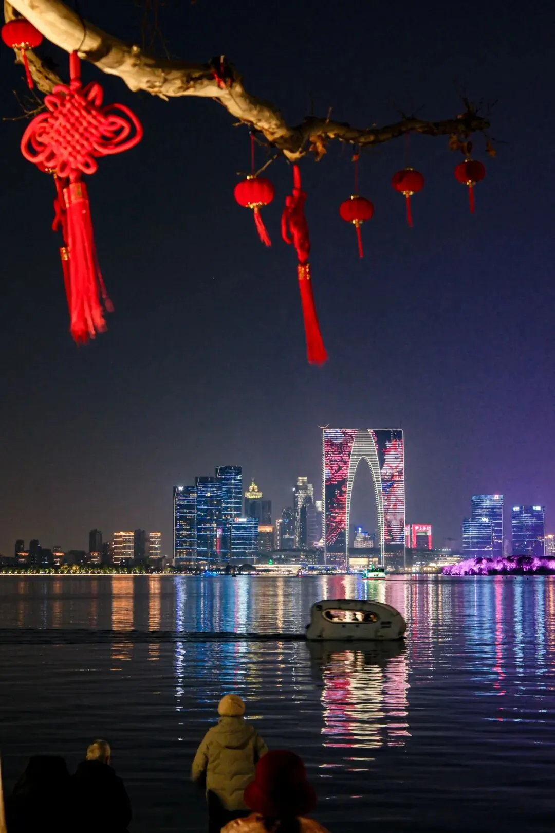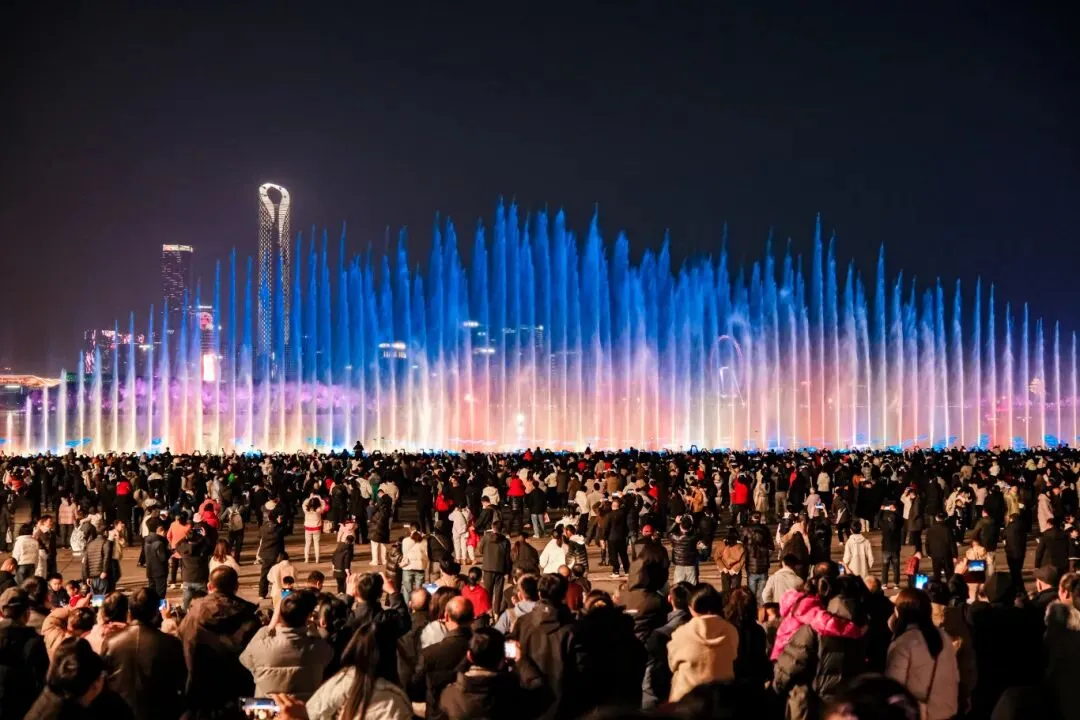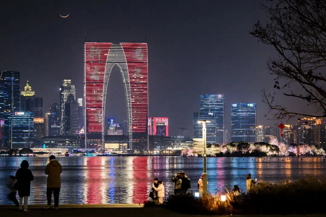 环金鸡湖新春灯光秀璀璨上线,与处处点缀的红灯笼、中国结相映成趣,将湖畔夜景装点得流光溢彩。金鸡湖音乐喷泉在假期连续开放9场,伴随《春节序曲》等经典旋律,吸引大量游客驻足观赏。值得一提的是,金鸡湖的绚丽夜景更是精彩亮相中央广播电视总台“CGTN超级夜看春晚”,向全国观众展示了苏州的现代节日风情。