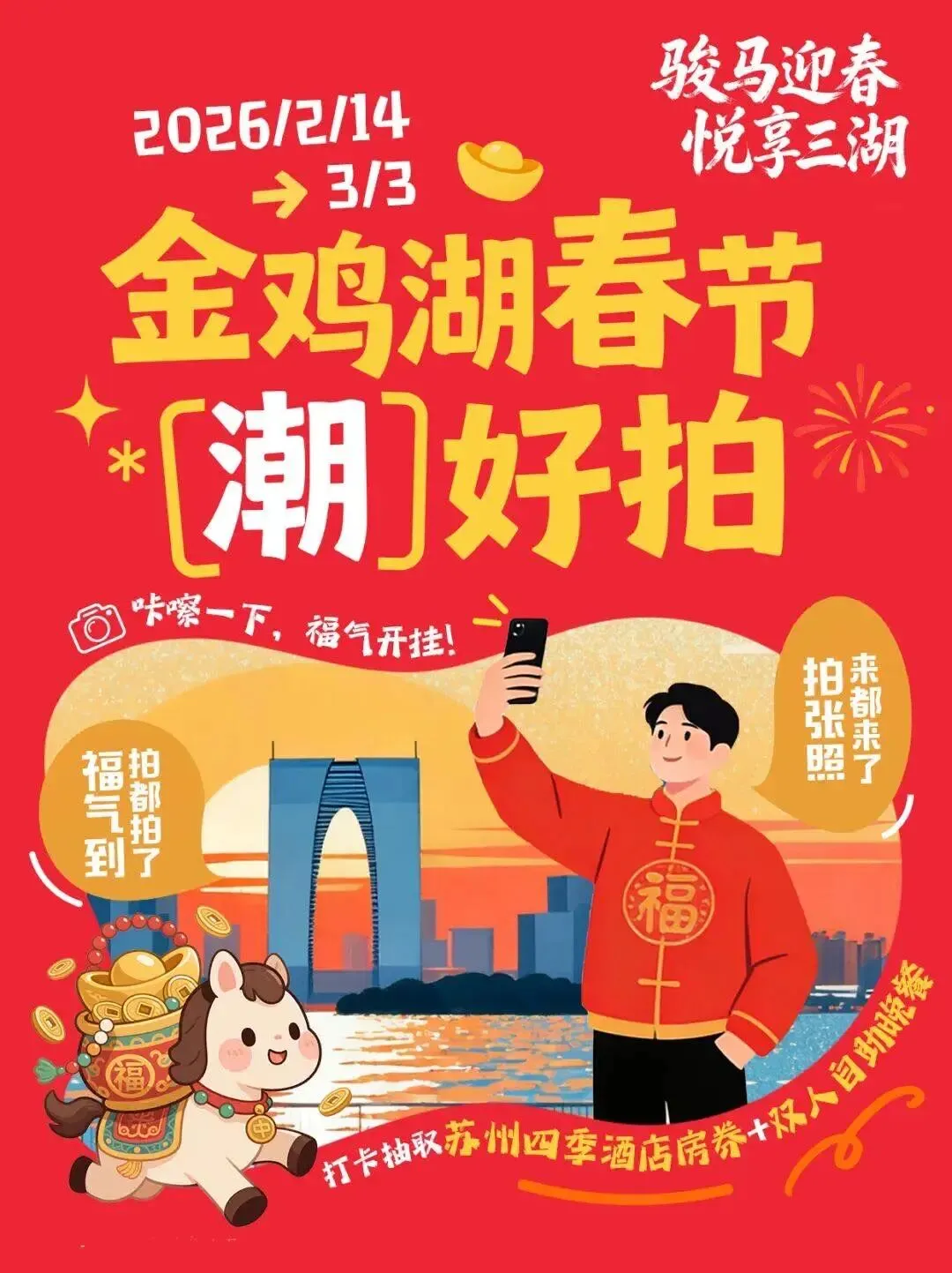 爱在金鸡湖·团聚“家”年华为亲子家庭送上登岛游船和苏州当代美术馆、苏州之眼摩天轮游等暖心礼遇。金鸡湖桃花岛“新春桃源季”携“酥年游园宝典”带来沉浸式游园体验。苏州之眼摩天轮以“马上转运”为马年新春主题,在128米高空打造了融合祈福、餐饮与演出的云端舞台,鱼灯巡游、国潮电音、机器狗拜年等环节,为市民游客开启了兼具传统韵味与科技感的新年惊喜。