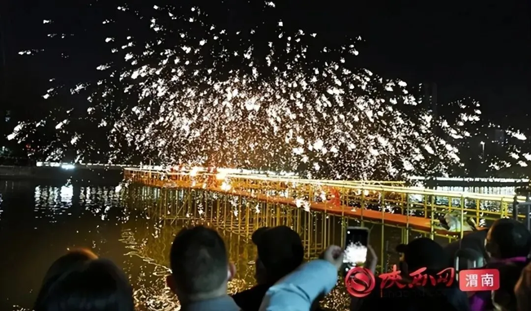 渭南老街打铁花表演,高温铁水凌空挥洒,化作漫天金雨,与岸边花灯交相辉映。