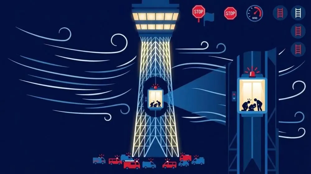 与此同时,位于更高处的展望台内,约1200名游客也陷入了茫然。电梯停运,他们无法下楼,只能滞留在高空,等待救援。