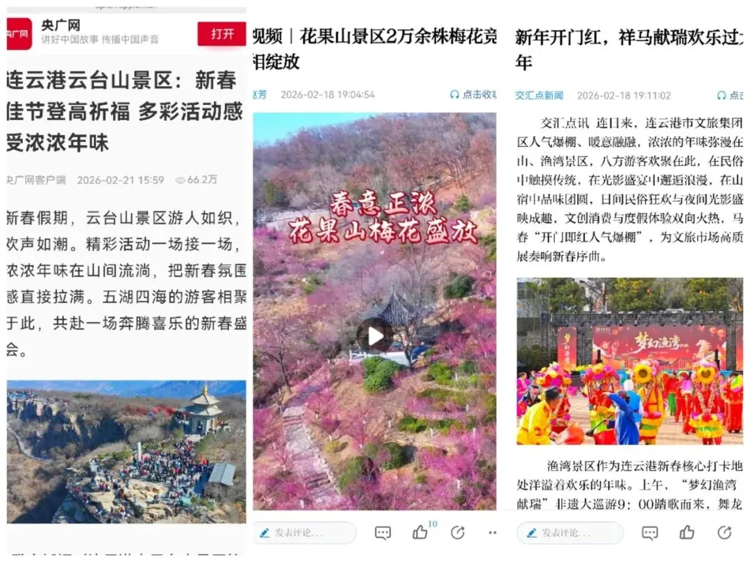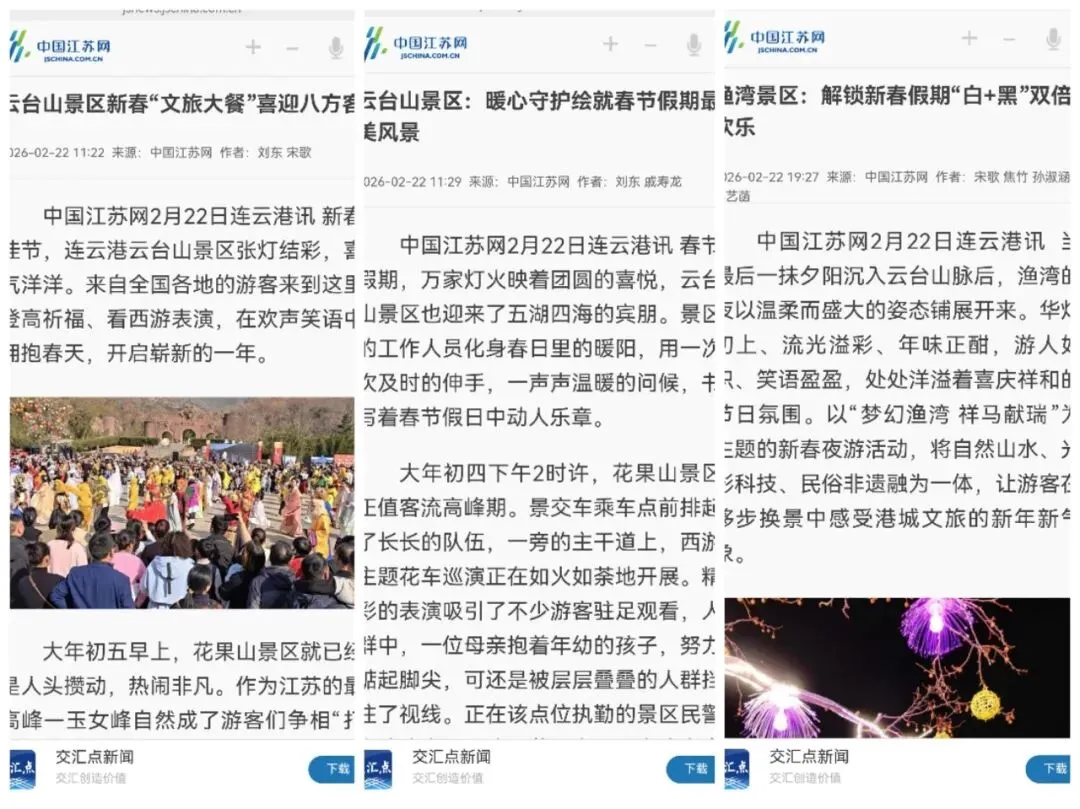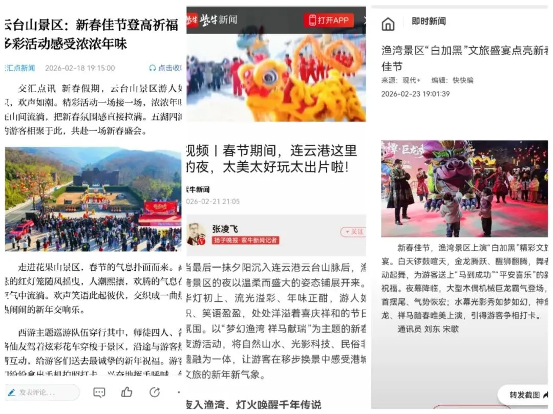春节假期,景区高频推送活动盛况及暖心服务,景区自媒体视频浏览量达2600万次,线上直播累计165场,总曝光量达850万人次。景区三度亮相央视,央视新闻频道《共同关注》栏目现场连线渔湾景区,用5分钟时长向全国观众全景展现这场年味十足的新春盛宴。人民网、央广网、正午江苏、交汇点、中国江苏网等主流媒体聚焦报道40余次,全方位展现了景区的文旅吸引力与品牌影响力。