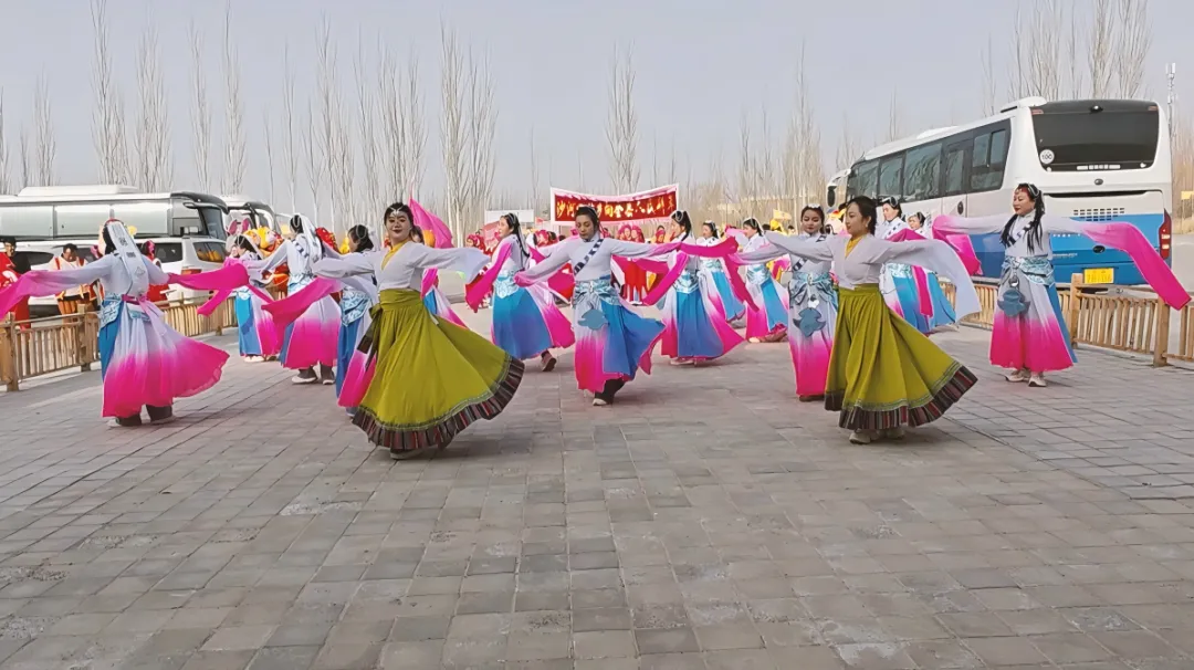 随后,两段极具民族特色的舞蹈接连登场。演员们身着绚丽的民族服饰,踏着明快的鼓点翩然起舞,舞步灵动舒展、动作整齐划一,将民族文化的独特韵味展现得淋漓尽致,曼妙的舞姿引得游客纷纷驻足观赏、拍手叫好。此外,手持“杞红映春浓”“骏马驮福至”等标语的民俗方阵依次走来,喜庆的扮相与鲜明的主题相得益彰,为整场展演增添了浓厚的时代气息与地方特色。