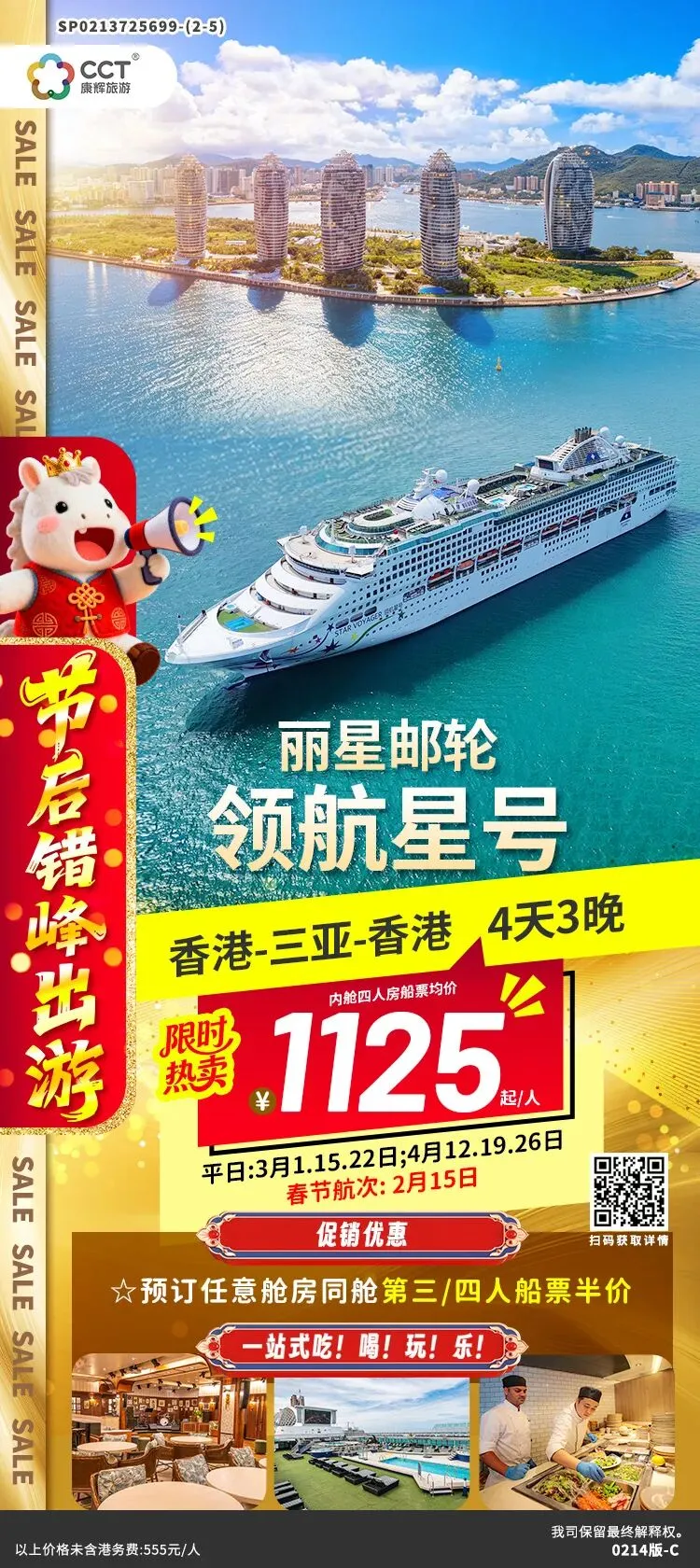 ✨ 亮点:奔赴三亚椰风海韵,同舱第三、四人船票半价,全家出行超划算,海上躺平看南海风光