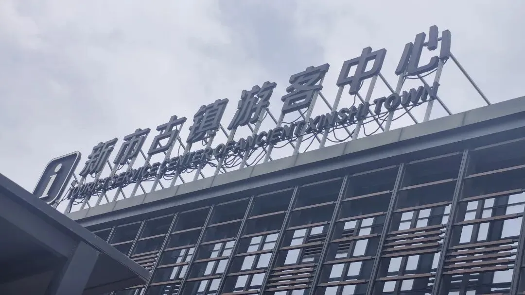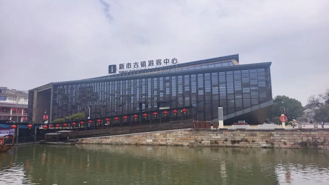 以前虽然也去过多次古镇,但这次感觉有点变化,在古镇南部建造了一个大型“游客中心”,增加了从“游客中心”至“老古镇”的线路(包含沈铨故居),还增添了“新市古镇运河新天地”。 1.游客中心:依托“白墙灰瓦,小桥流水”的地方特色,从建筑结构中提取色彩与造型特点,将新市的古韵以现代质朴的镂空辅助图形的方式呈现,多层的设计,增加了层次感,内敛简洁,使导视系统融于古镇环境。