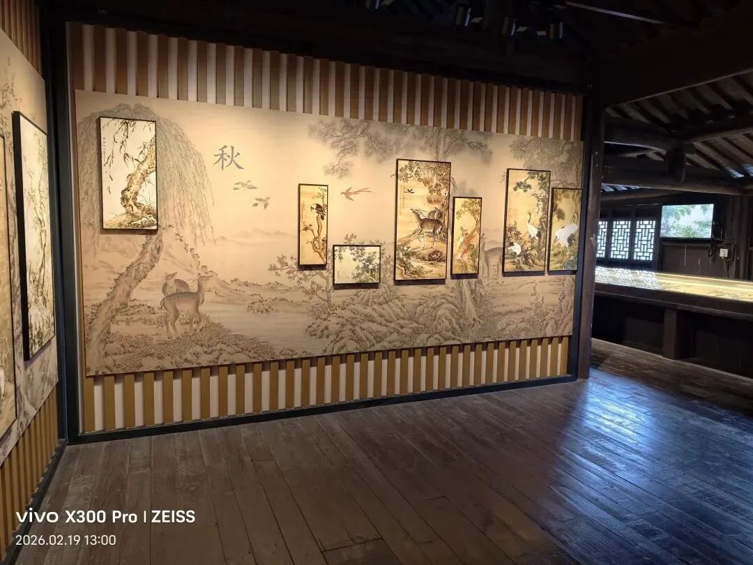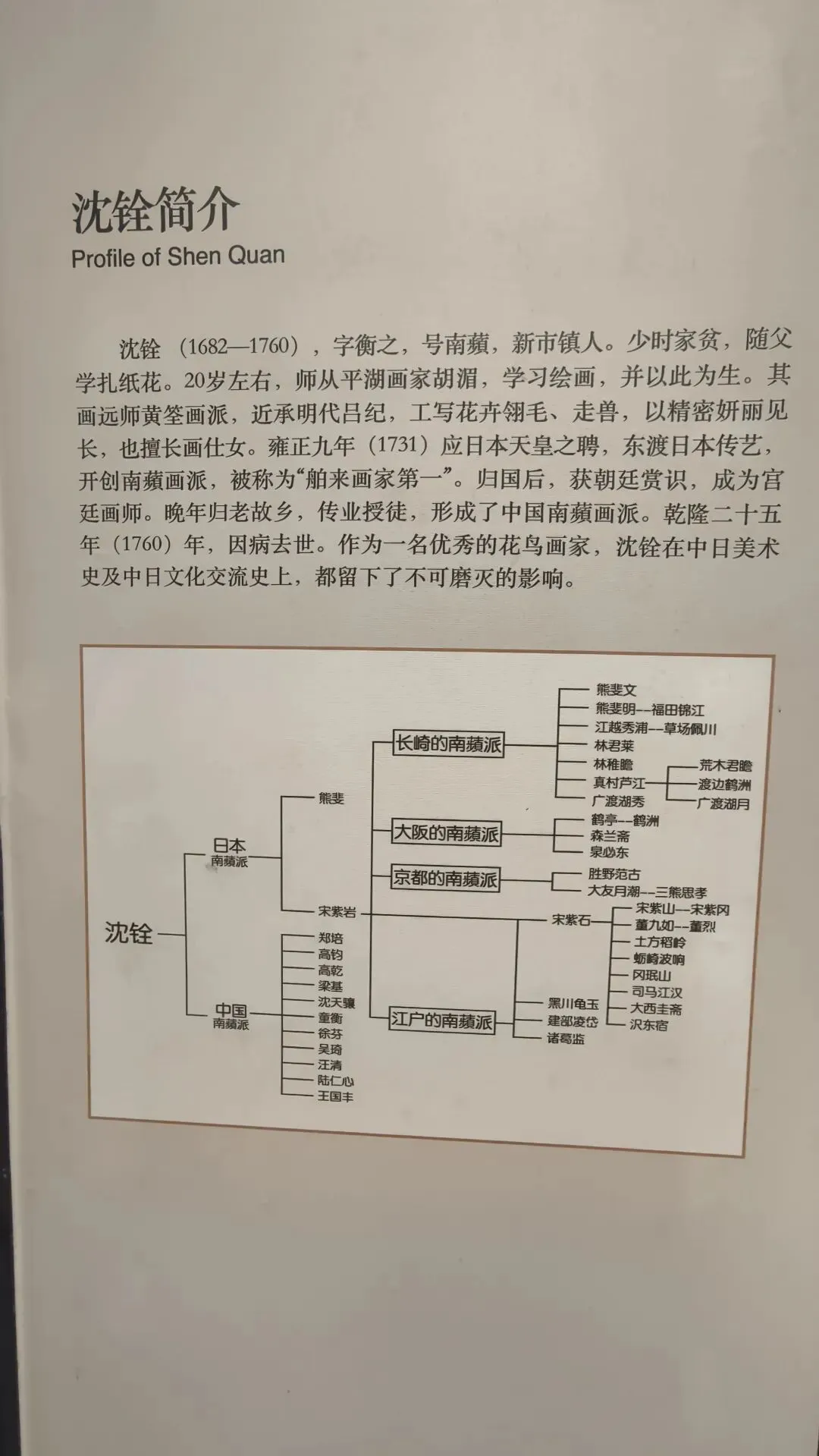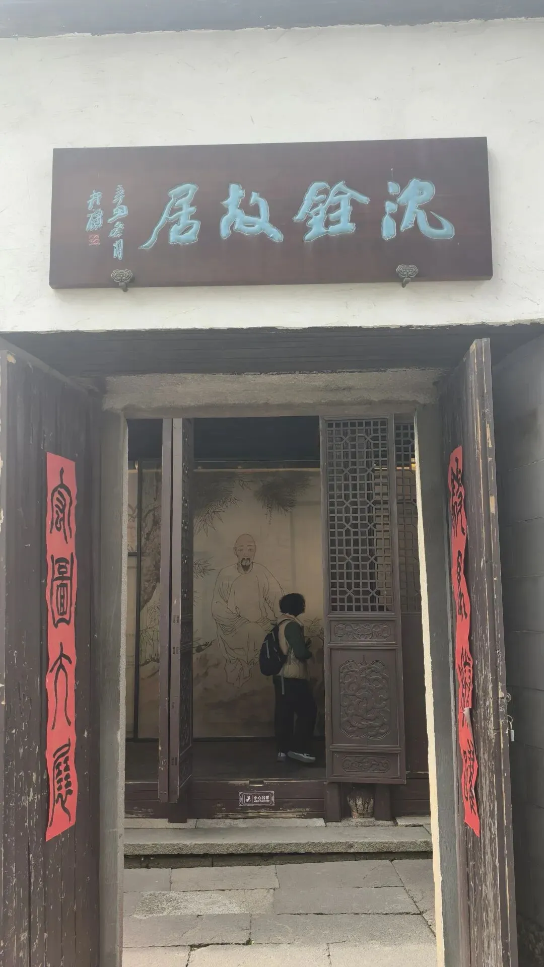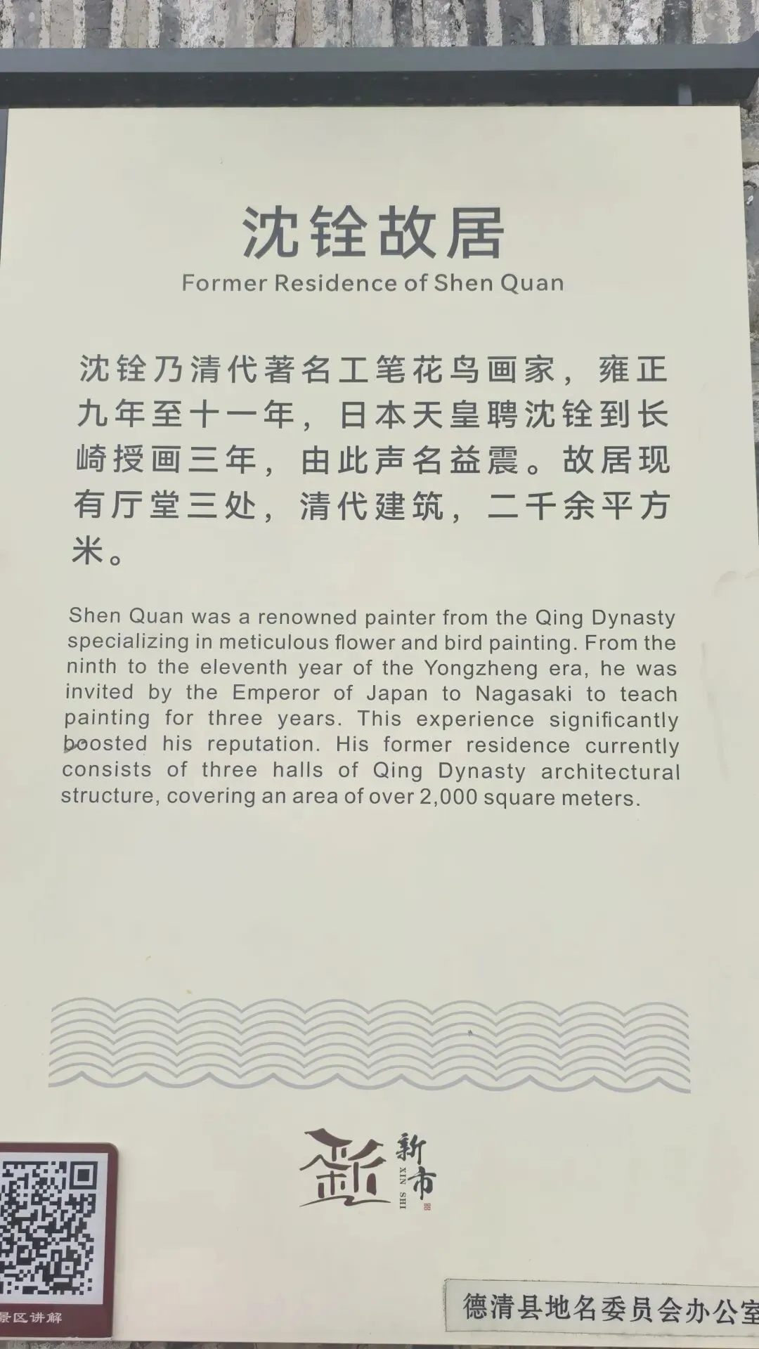从游客中心前门走至后面,过河就是“沈铨故居”。 2.沈铨故居:清代著名的花鸟画家沈铨(1682—1760)的出生地及艺术生涯见证地,现为对外开放的文化景点。故居为清代建筑,现存5厅7天井,占地面积约450平方米,由沈铨六世孙女沈美玉居住;经修复后分为两层:一层展示沈铨学艺、创立“南苹画派”的图文资料,二层陈列其20余幅复刻代表作(如《秋花狸奴图》《五伦图》)。沈铨被誉为“舶来画家第一”,曾东渡日本传艺三年,其工笔花鸟画影响深远,故居现为德清县文旅融合示范点,游客可体验绘画或书法活动。