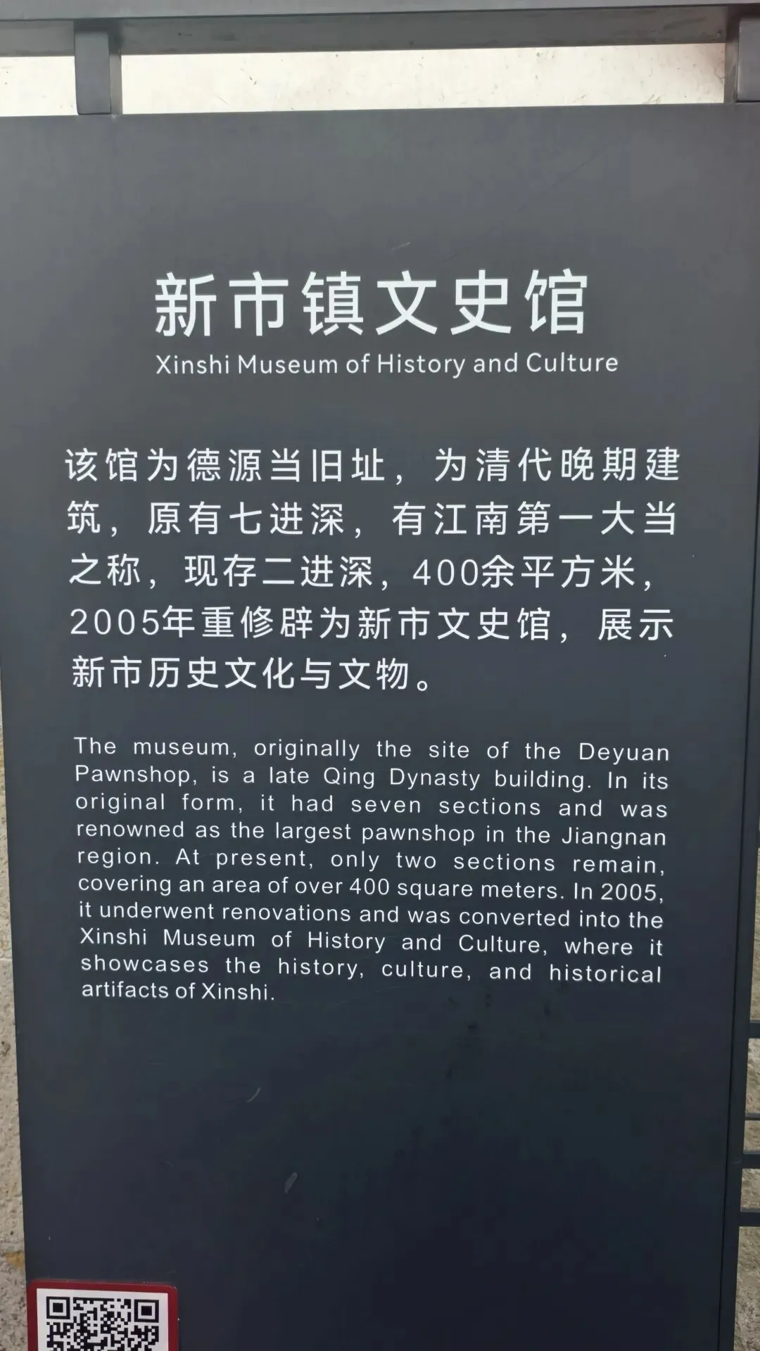 4.新市镇文史馆:原为清代“德源当”旧址(江南第一大当),清代晚期建筑,现存二进深,2005年重修。建筑面积约400平方米,分两层陈列,是展示新市千年历史文化的专题展馆。