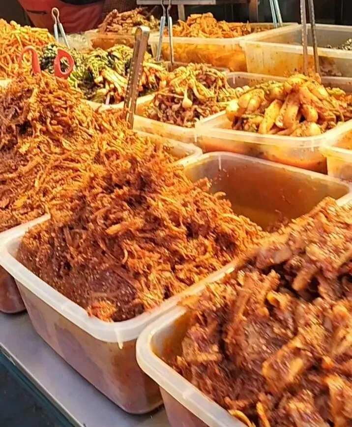 泡菜、米酒、鸡架、烤肉、小鱼饼、打糕、石锅拌饭、酱蟹、参鸡汤、芝士饼、这些美食在主街和小巷随处可见。