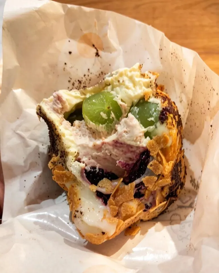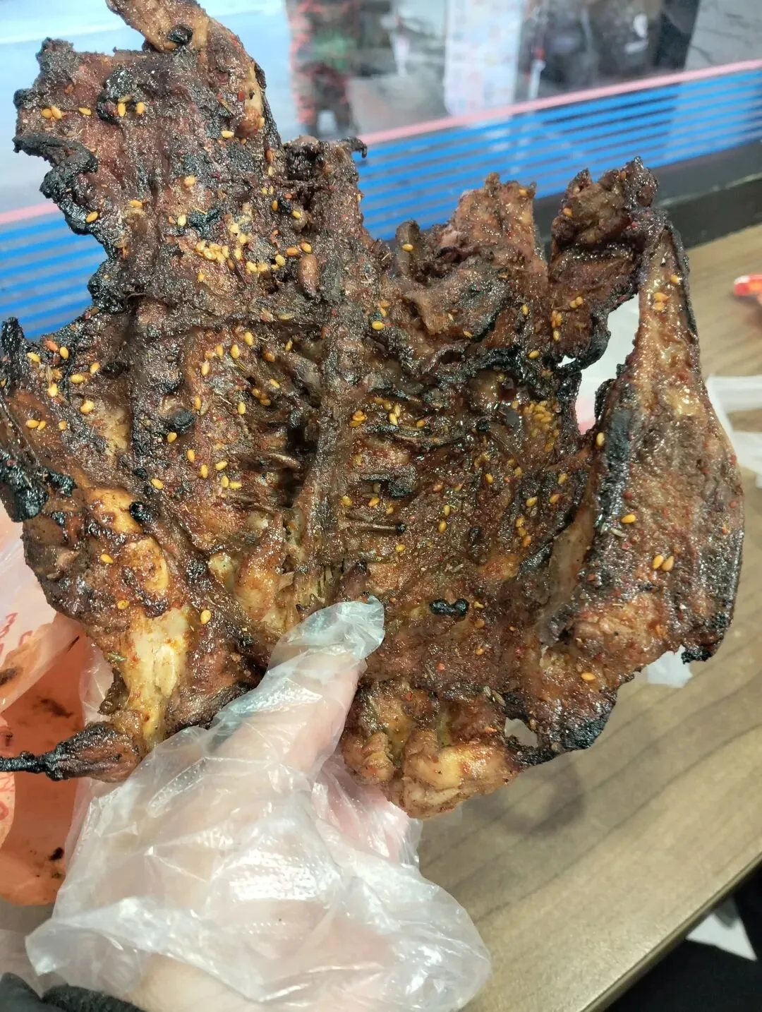 我和儿子看这么多美食,胃实在装不下太多,排长队一小时买了烤鸡架,随后买小鱼饼、芝士饼、水果奶酪麻糍。