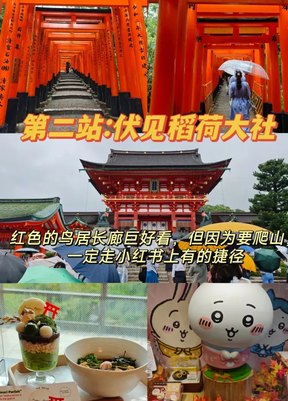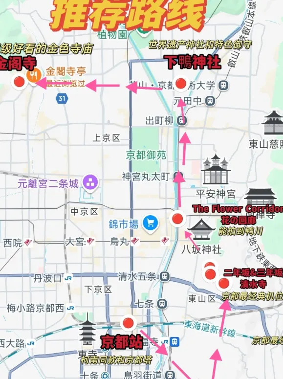 各位注意带好现金哦,景点门票基本上都是现金.京都真的很宝藏,各个景点都出片而且旅游业完善,巴士地铁等都能到达景点。当然很多小伙伴也不知道要去京都巨多世界遗产中哪几个,特整理了一个经典的京都一日游路线,出片不累~ 👟推荐路线,见图2: ①京都站→②伏见稻荷大社→③二年坂三年坂→④清水寺→⑤The Flower Corridor 花の回廊→⑥下鴨神社→⑦鹿苑寺 🗺️强推开始就在京都站的公交车始发广场那里买京都地铁公交一日卡,基本上路线涉及的景点都能覆盖到。 ❗永观堂南禅寺蓝瓶咖啡等没放是因为更适合雨天而且距离公交地铁站比较远,如果雨天可以和金阁寺换一下。八坂神社没放因为确实比较普通,锦市场不放是因为完全没地方逛吃买全是人。 💰各位注意带好现金哦,景点门票基本上都是现金。