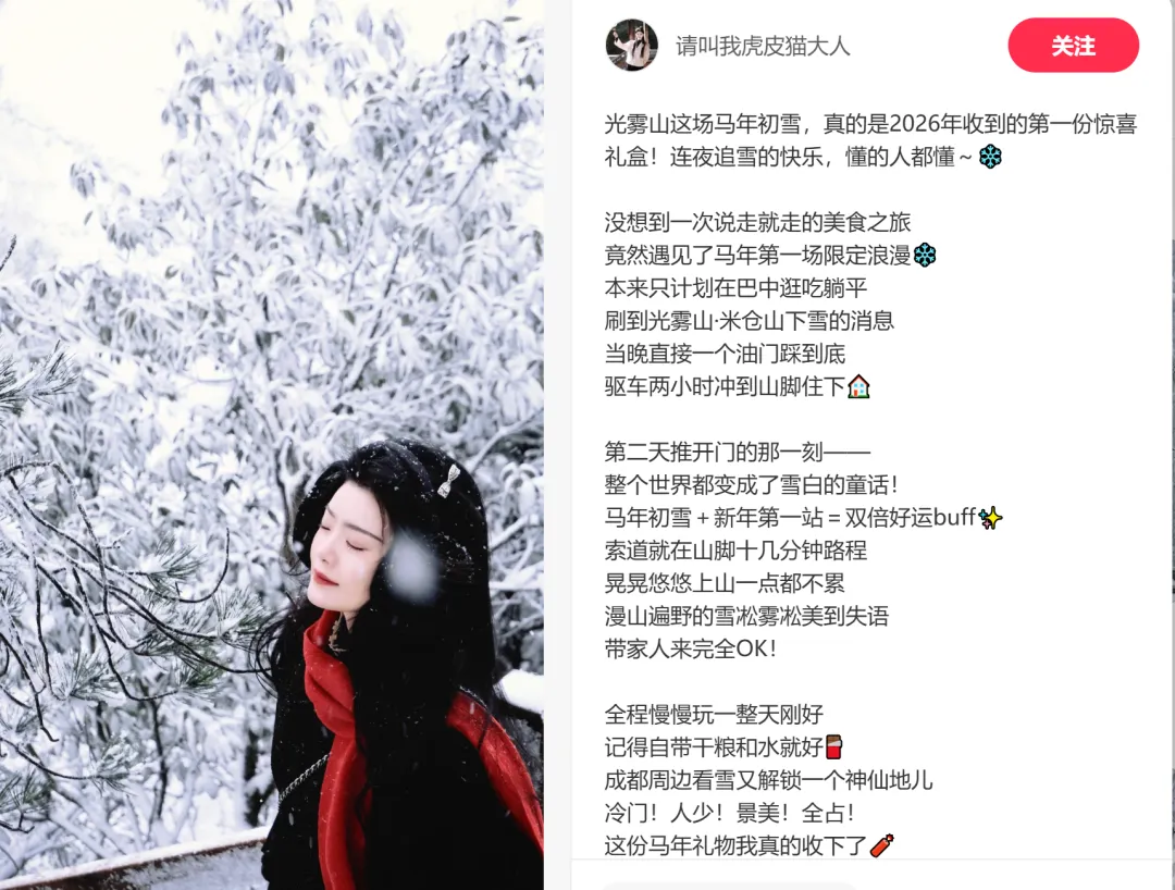 新年新气象!2026年春节,光雾山景区精心策划“马上有福”新春主题活动,以浓郁年味、特色民俗、暖心宠客服务诚迎八方游客。节日期间,年味浓、服务暖、人气旺!用满山冰雪诚意,交出一份亮眼答卷,实现马年新春开门红!🧧